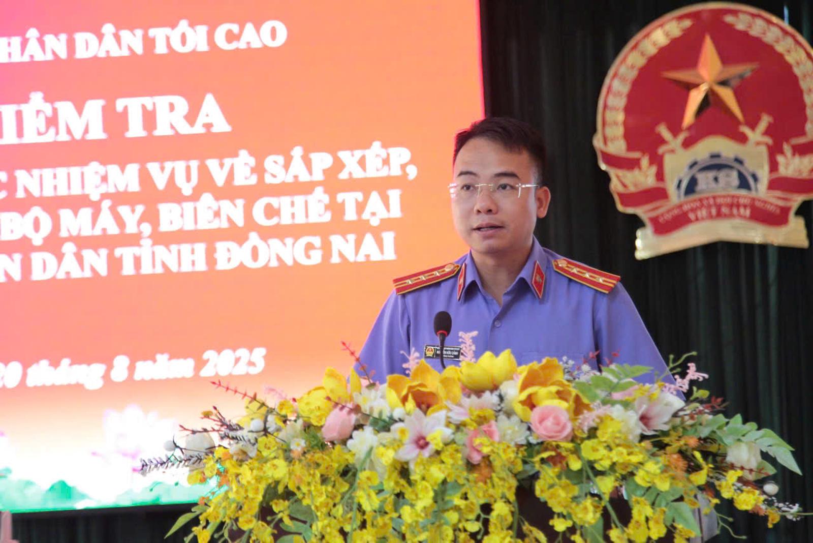 Tại hội nghị, ông Nguyễn Hữu Cảnh, Trưởng phòng Thanh tra VKSNDTC công bố Quyết định số 284/QĐ-VKSTC ngày 28/7/2025 của Viện trưởng VKSNDTC. Mục tiêu kiểm tra nhằm đánh giá toàn diện việc quán triệt, tổ chức thực hiện các quy định của Đảng, Nhà nước và ngành Kiểm sát về sắp xếp, tinh gọn tổ chức bộ máy, biên chế. Đồng thời, phát hiện kịp thời những khó khăn, vướng mắc và đề xuất các giải pháp phù hợp để nâng cao hiệu quả tổ chức, hoạt động của VKSND hai cấp tại tỉnh Đồng Nai.