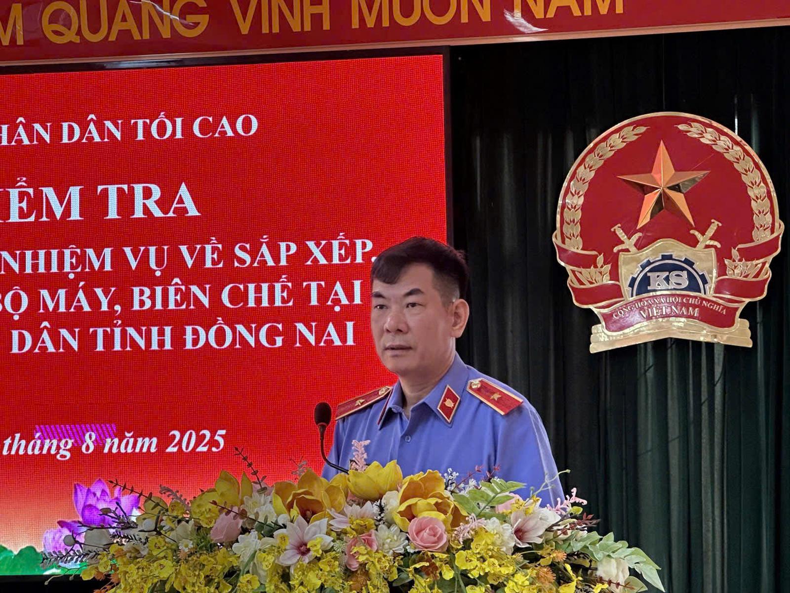 Báo cáo với đoàn kiểm tra, ông Ngô Hữu Nghĩa, Phó Viện trưởng VKSND tỉnh Đồng Nai cho biết, sau sáp nhập, do đặc thù địa bàn rộng và đông dân cư nên VKSND tỉnh Đồng Nai bố trí công tác tại Trụ sở chính và 2 cơ sở nhằm tạo điều kiện cho việc giải quyết các công việc. Về cơ cấu tổ chức, VKSND tỉnh Đồng Nai hiện có 8 lãnh đạo viện, 11 đơn vị cấp phòng và 14 VKSND khu vực.