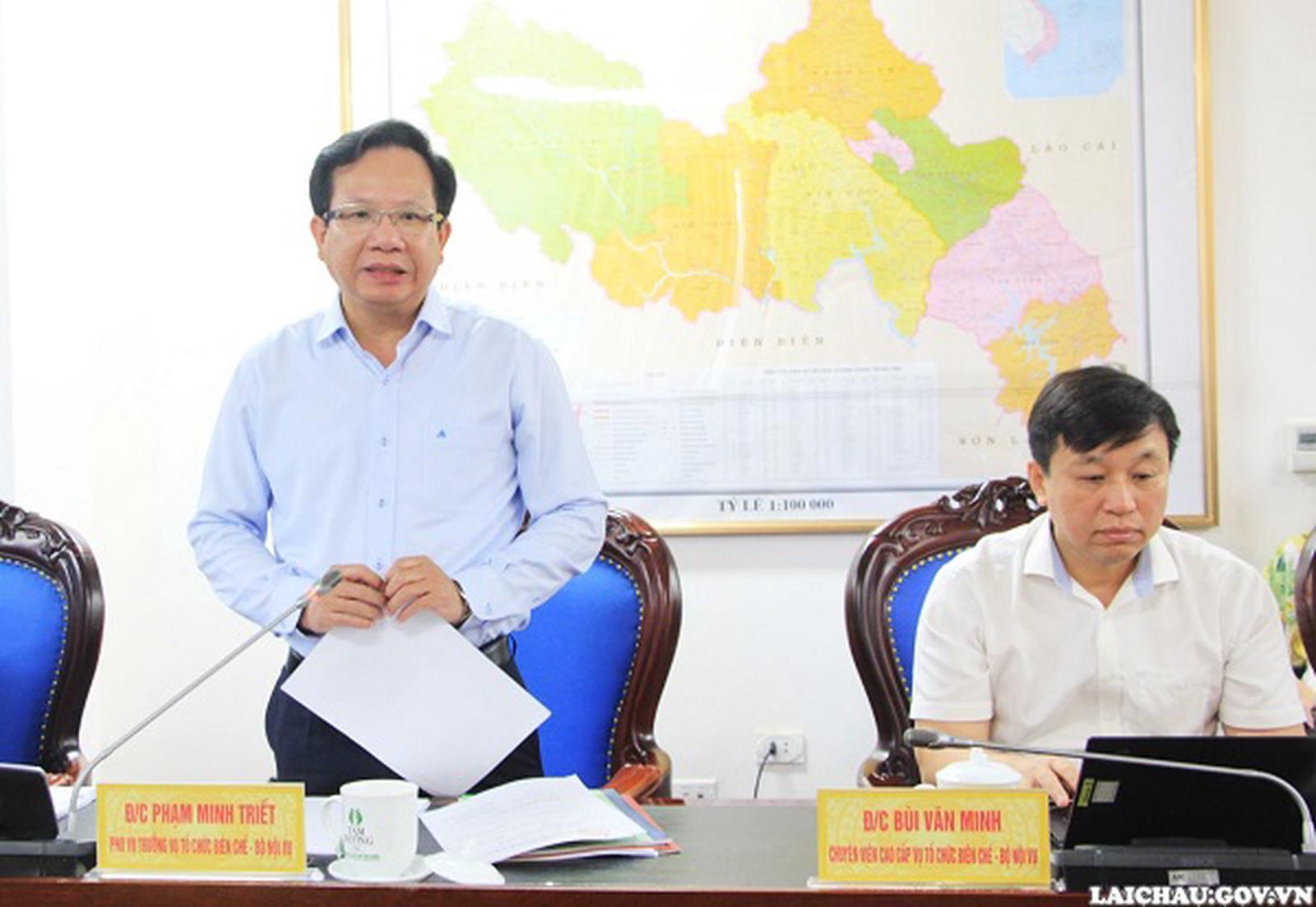 Ông Phạm Minh Triết, Phó Vụ trưởng Vụ Tổ chức biên chế, Bộ Nội vụ, phát biểu tại buổi làm việc. Ảnh: Laichau.gov.vn