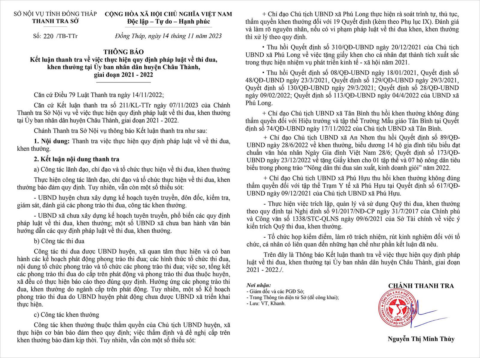 Ngày 14/11/2023, Sở Nội vụ tỉnh Đồng Tháp đã có Văn bản số 220/TB-TTr thông báo kết luận thanh tra về việc thực hiện quy định pháp luật về thi đua, khen thưởng tại UBND huyện Châu Thành, giai đoạn 2021 - 2022.