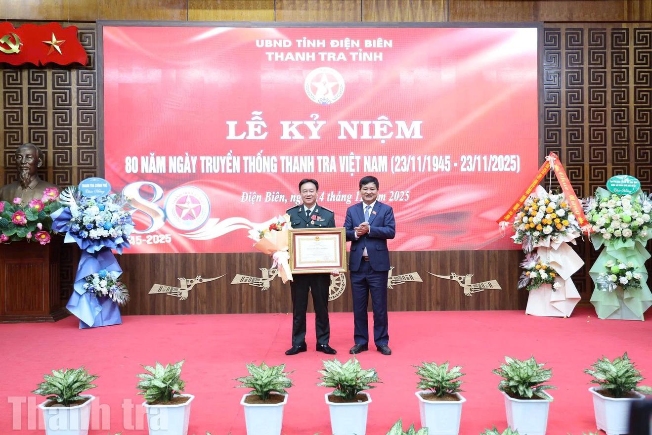 Chánh Thanh tra tỉnh Điện Biên Vùi Văn Nguyện đón nhận Huân chương Lao động hạng Nhì tại lễ kỷ niệm 80 năm thành lập ngành Thanh tra Việt Nam. Ảnh: PV