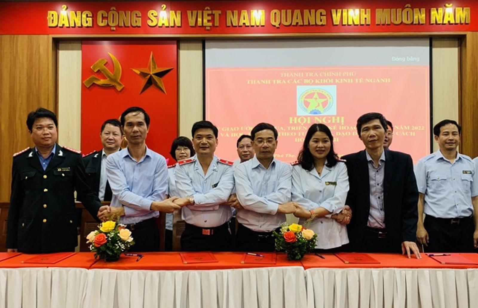 (Thanh tra) - Chiều ngày 25/3, tại tỉnh Phú Thọ, thanh tra 6 bộ thuộc Khối Kinh tế ngành (Khối I), gồm: Bộ Giao thông vận tải (Khối trưởng), Bộ Tài nguyên và Môi trường (Khối phó), Bộ Thông tin và Truyền thông, Bộ Xây dựng, Bộ Công Thương và Bộ Nông nghiệp và Phát triển nông thôn đã tổ chức hội nghị giao ước thi đua năm 2022.