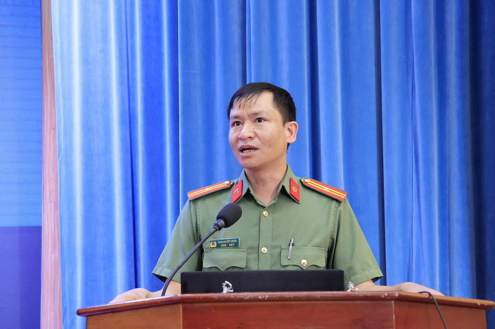 Thiếu tá Đinh Quyết Chiến, Phòng An ninh chính trị nội bộ Công an tỉnh Lâm Đồng đã trực tiếp truyền đạt các nội dung trọng tâm liên quan đến công tác bảo vệ bí mật nhà nước. Ảnh: Vũ Linh