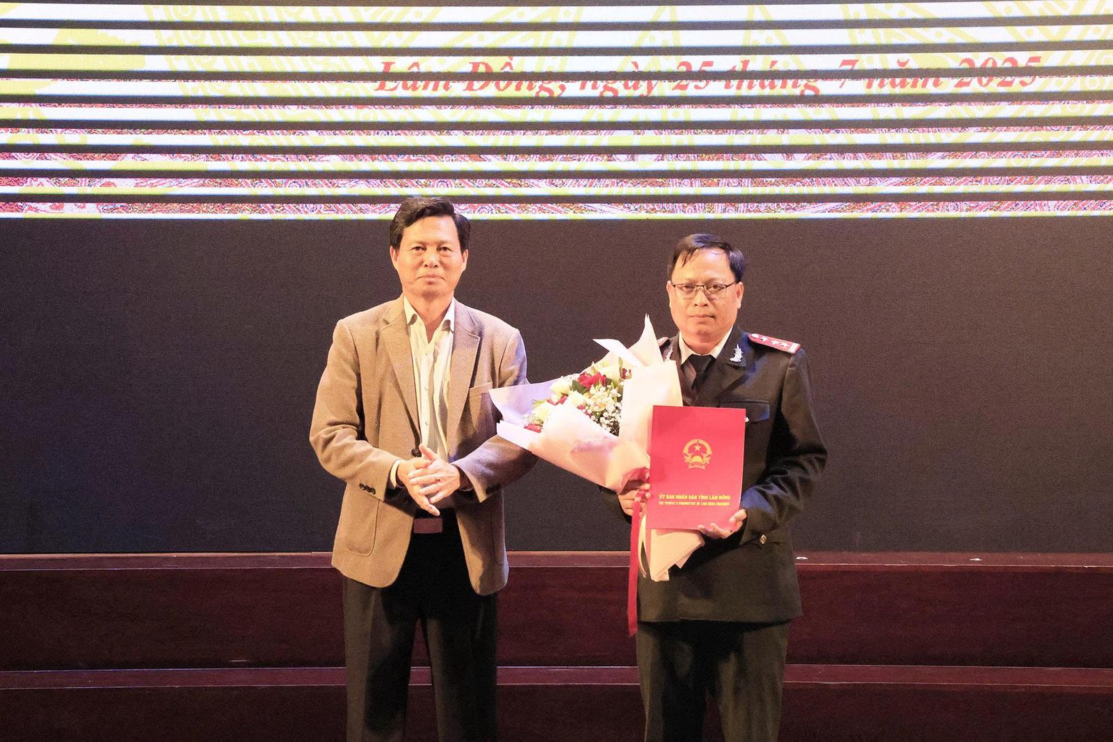 Ông Hoàng Xuân Hường, Phó Bí thư Đảng ủy UBND tỉnh trao quyết định và tặng hoa cho ông Trần Thanh Toàn, Phó Bí thư Thường trực Đảng ủy Thanh tra tỉnh Lâm Đồng. Ảnh: CTV