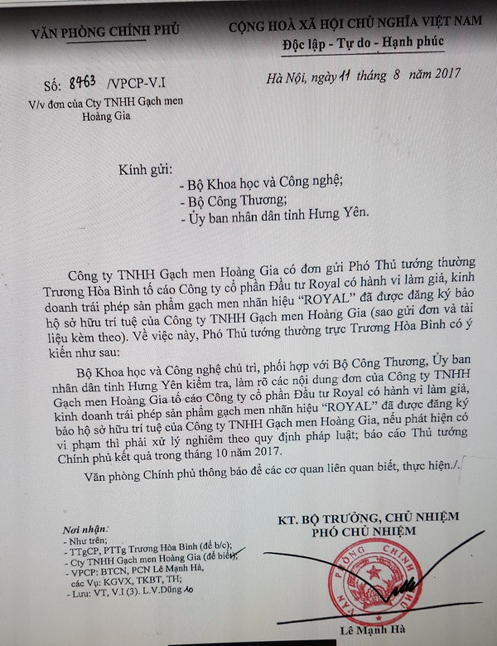 Mới đây, ngày 9/10/2017, thực hiện chỉ đạo của Phó Thủ tướng Thường trực Trương Hòa Bình về tố cáo Công ty Cổ phần Đầu tư Royal có hành vi làm giả, kinh doanh trái phép sản phẩm gạch men nhãn hiệu “ROYAL” đã được đăng ký bảo hộ sở hữu trí tuệ của Công ty TNHH Gạch men Hoàng Gia, Chánh Thanh tra Bộ Khoa học và Công nghệ Trương Hồng Dương đã ký văn bản gửi Công ty Cổ phần Đầu tư Royal đề nghị chuẩn bị báo cáo và làm việc với đoàn công tác gồm đại diện Bộ Khoa học và Công nghệ, Văn phòng Chính phủ, Bộ Công an, Bộ Công thương và Văn phòng Ban Chỉ đạo 319 Quốc gia để kiểm tra, làm rõ các nội dung nêu trong đơn.