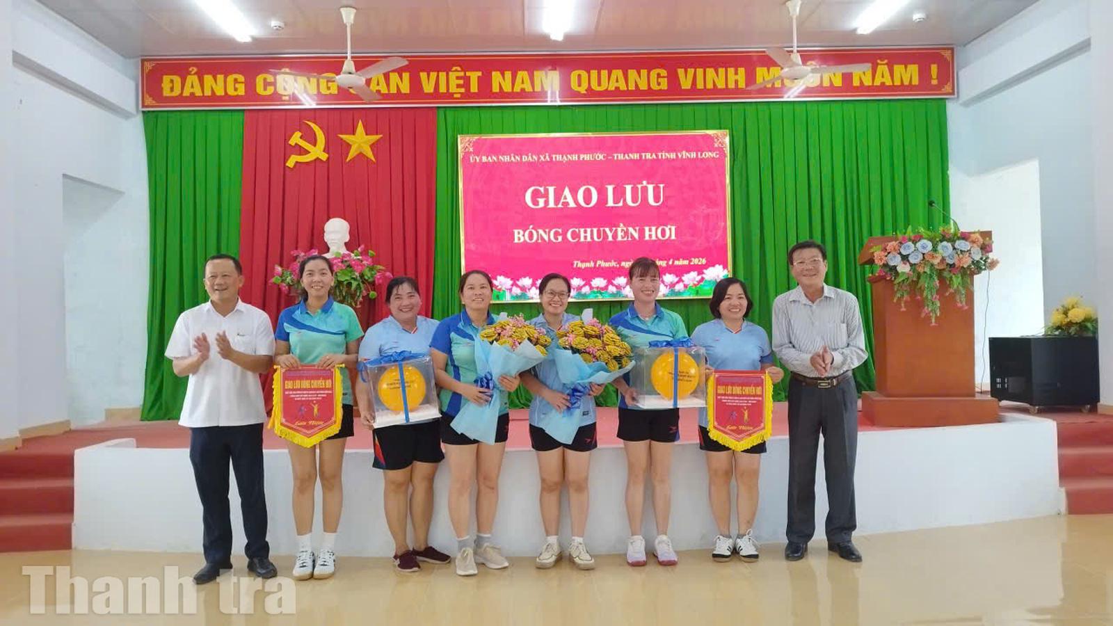 Ông Phạm Minh Hòa (bìa trái) - Phó Chánh Thanh tra tỉnh và Ông Phạm Thanh Hùng (bên phải) – Bí thư Đảng uỷ xã Thạnh Phước trao cờ lưu niệm cho các đội tham gia giao lưu bóng chuyền hơi. Ảnh: HN