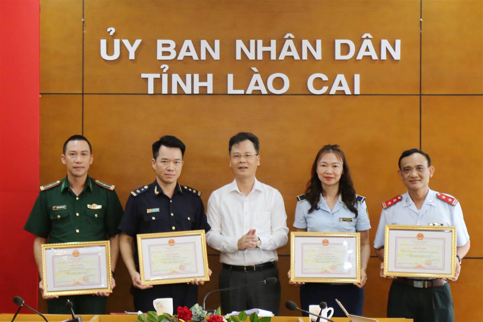 Phó Chủ tịch UBND tỉnh Lào Cai Nguyễn Thành Sinh tặng bằng khen cho các đơn vị có thành tích xuất sắc. Ảnh: ND