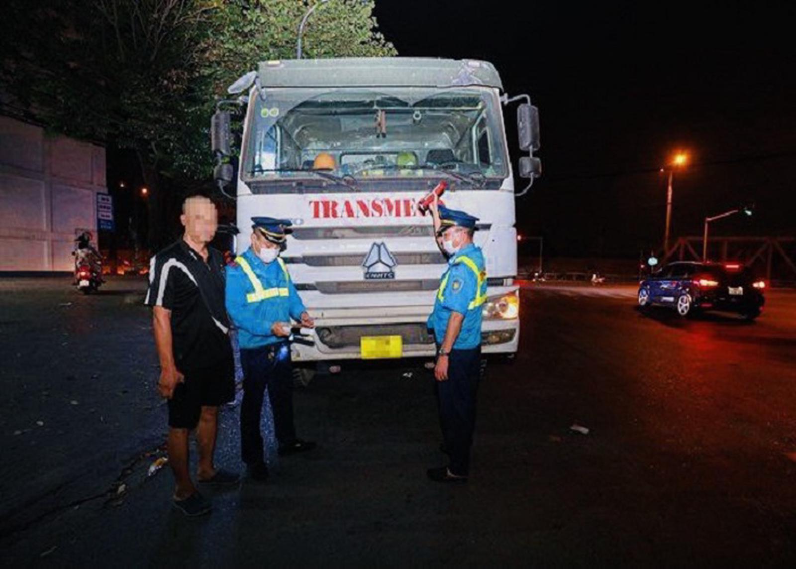 Lực lượng thanh tra giao thông kiểm tra phương tiện chở hàng. Ảnh: TQ