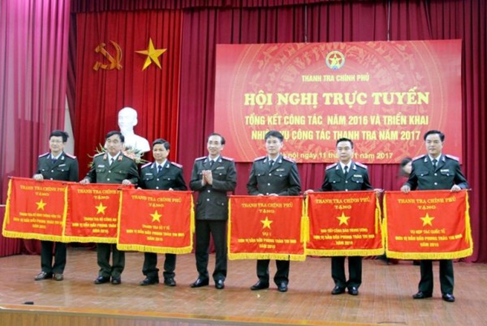 Thanh tra Chính phủ tặng Cờ Thi đua, Bằng khen cho 35 tập thể Tổng Thanh tra Chỉnh phủ (TTCP) Lê Minh Khái đã ký quyết định tặng Cờ Thi đua cho 16 tập thể đã hoàn thành xuất sắc toàn diện nhiệm vụ công tác, dẫn đầu phong trào thi đua yêu nước của ngành Thanh tra năm 2017. Phó Tổng Thanh tra Đặng Công Huẩn trao Cờ Thi đua cho các đơn vị thuộc TTCP và Thanh tra bộ, ngành, địa phương. Ảnh: HH Theo đó, các tập thể được tặng Cờ Thi đua của TTCP là: Cục Giải quyết Khiếu nại (KN), tố cáo (TC) và Thanh tra Khu vực 1 (Cục 1) TTCP; Vụ Kế hoạch, Tài chính và Tổng hợp (TTCP); Vụ Pháp chế (TTCP). Thanh tra các Bộ: Thông tin và Truyền thông; Tư pháp; Y tế. Thanh tra các tỉnh, thành phố: Hà Nội; Ninh Bình; Đắk Lắk; Lào Cai; Hòa Bình; Quảng Trị; Khánh Hòa; Vĩnh Long; Tây Ninh. Tổng Thanh tra cũng đã ký quyết định tặng Bằng khen cho 19 tập thể đã có thành tích xuất sắc trong công tác năm 2016, 2017. Cụ thể: Vụ Giám sát, thẩm định và xử lý sau thanh tra (TTCP); Ban Tiếp dân Trung ương (TTCP); Văn phòng Đảng, đoàn thể (TTCP); Thanh tra các Bộ: Tài nguyên và Môi trường; Quốc phòng; Ngoại giao; Thanh tra các tỉnh: Hưng Yên; Bắc Ninh; Lâm Đồng; Lai Châu; Bắc Giang; Hà Tĩnh; Thừa Thiên Huế; Quảng Nam; Bến Tre; Sóc Trăng; Đồng Nai. Trường Cán bộ Thanh tra cũng được nhận Bằng khen của Tổng TTCP vì đã có thành tích xuất sắc trong công tác đào tạo năm 2017. Tổng TTCP đã quyết định tặng Bằng khen cho Thanh tra Bộ Lao động - Thương binh và Xã hội vì đã có thành tích xuất sắc trong công tác thanh tra việc thực hiện chính sách ưu đãi người có công với cách mạng. Bên cạnh các tập thể được nhận Cờ Thi đua và Bằng khen của Tổng TTCP, nhiều cá nhân công tác tại các cục, vụ, đơn vị thuộc TTCP cũng được Chủ tịch nước tặng Huân chương Độc lập, Huân chương Lao động, Thủ tướng Chính phủ tặng Bằng khen. Cụ thể, Chủ tịch nước tặng thưởng Huân chương Độc lập hạng Ba cho nguyên Phó Tổng TTCP Nguyễn Đức Hạnh vì đã có thành tích đặc biệt xuất sắc trong quá trình công tác, góp phần vào sự nghiệp xây dựng chủ nghĩa xã hội và bảo vệ Tổ quốc. Chủ tịch nước cũng đã ký tặng thưởng Huân chương Lao động hạng Nhì cho ông Nguyễn Hồng Điệp - Trưởng Ban Tiếp công dân Trung ương và Huân chương Lao động hạng Ba cho 4 đồng chí: Ngô Đại Tuấn - Chánh Văn phòng TTCP; Ngô Mạnh Hùng - Phó Cục trưởng Cục Chống tham nhũng TTCP;Văn Tiến Mai - Phó Vụ trưởng Vụ Kế hoạch, Tài Chính và Tổng hợp TTCP; Đặng Khánh Toàn - Vụ trưởng Vụ Giám sát Thẩm định và Xử lý sau thanh tra TTCP vì đã có thành tích xuất sắc trong công tác từ năm 2012 đến năm 2016, góp phần vào sự nghiệp xây dựng chủ nghĩa xã hội và bảo vệ Tổ quốc. Ngoài ra, Chủ tịch nước cũng tặng thưởng Huân chương Lao động hạng Ba cho 2 đồng chí nguyên là cán bộ công tác tại TTCP là ông Nguyễn Trung Thành - nguyên Hàm Phó Vụ trưởng Vụ Tổ chức Cán bộ và ông Nguyễn Sỹ Minh - nguyên Phó Cục trưởng Cục Giải quyết KN, TC và Thanh tra Khu vực 3 (Cục 3). Hải Hà