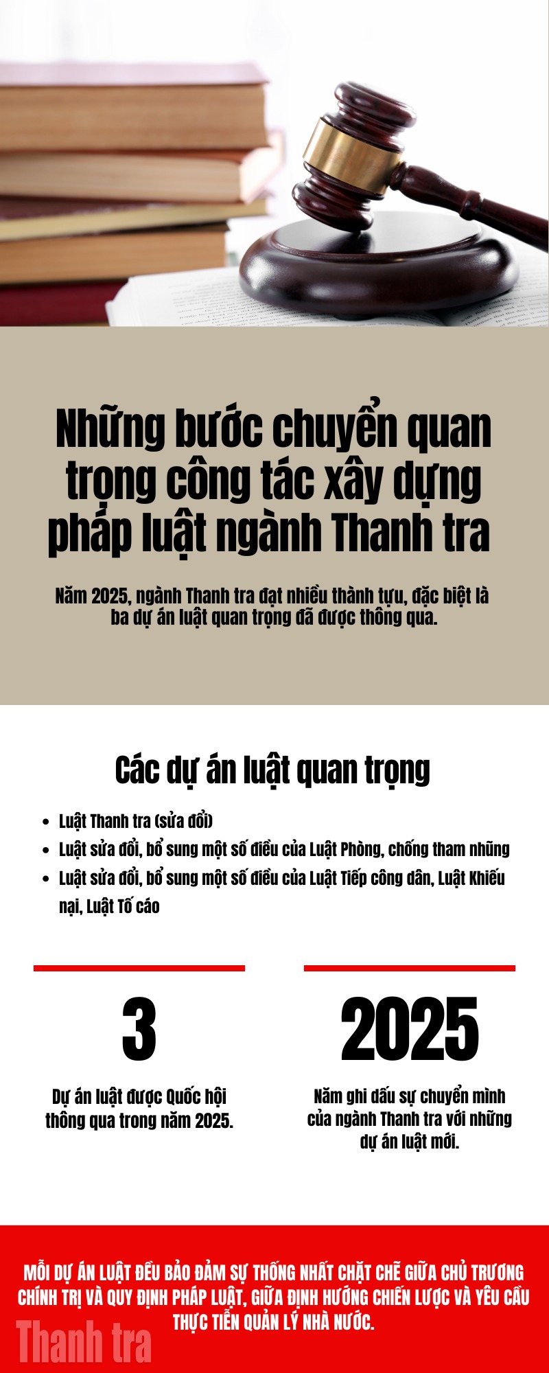 Từ những nền tảng chính trị - pháp lý nêu trên, năm 2025, công tác xây dựng pháp luật của ngành Thanh tra đã có những bước chuyển quan trọng, mang tính dấu mốc. Điểm nhấn là Quốc hội đã thông qua 3 dự án luật do Thanh tra Chính phủ chủ trì soạn thảo, gồm: Luật Thanh tra (sửa đổi); Luật sửa đổi, bổ sung một số điều của Luật Phòng, chống tham nhũng; và Luật sửa đổi, bổ sung một số điều của Luật Tiếp công dân, Luật Khiếu nại, Luật Tố cáo.