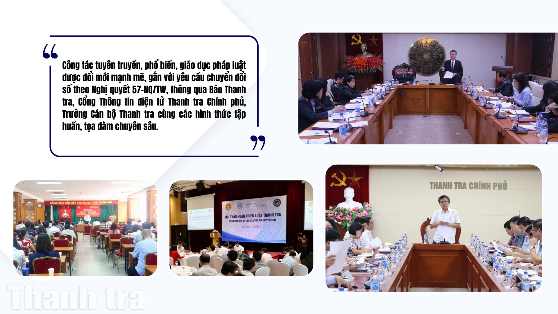 Công tác tuyên truyền, phổ biến, giáo dục pháp luật được đổi mới mạnh mẽ, gắn với yêu cầu chuyển đổi số theo Nghị quyết 57-NQ/TW, thông qua Báo Thanh tra, Cổng Thông tin điện tử Thanh tra Chính phủ, Trường Cán bộ Thanh tra cùng các hình thức tập huấn, tọa đàm chuyên sâu. Qua đó, các chủ trương, nghị quyết của Đảng và các quy định pháp luật mới không chỉ được quán triệt sâu sắc trong đội ngũ cán bộ, công chức ngành Thanh tra, mà còn lan tỏa rộng rãi trong xã hội.