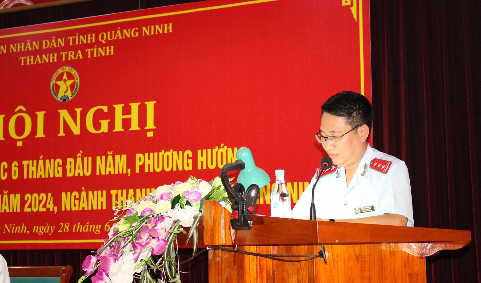 Phó Chánh Thanh tra tỉnh Quảng Ninh Trần Văn Hưng trình bày báo sơ kết công tác thanh tra, phòng chống tham nhũng, giải quyết KN, TC của ngành Thanh tra tỉnh. Ảnh: Trọng Tài