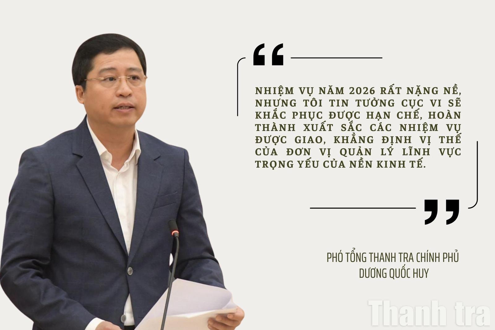 Năm 2026, Phó Tổng Thanh tra Dương Quốc Huy chỉ đạo, Cục VI cần ưu tiên nguồn lực để hoàn thiện, trình ban hành kết luận thanh tra đối với các cuộc thanh tra lớn như: Dự án Cảng hàng không quốc tế Long Thành, Tập đoàn Công nghiệp Cao su, Tập đoàn Than - Khoáng sản và hoạt động kinh doanh vàng. Yêu cầu đặt ra là kết luận phải chính xác, khách quan, đúng pháp luật, nhưng cũng phải đảm bảo tính khả thi, thấu tình đạt lý. Cục cũng cần chuẩn bị tốt lực lượng để triển khai các cuộc thanh tra theo kế hoạch và các cuộc thanh tra đột xuất theo chỉ đạo.