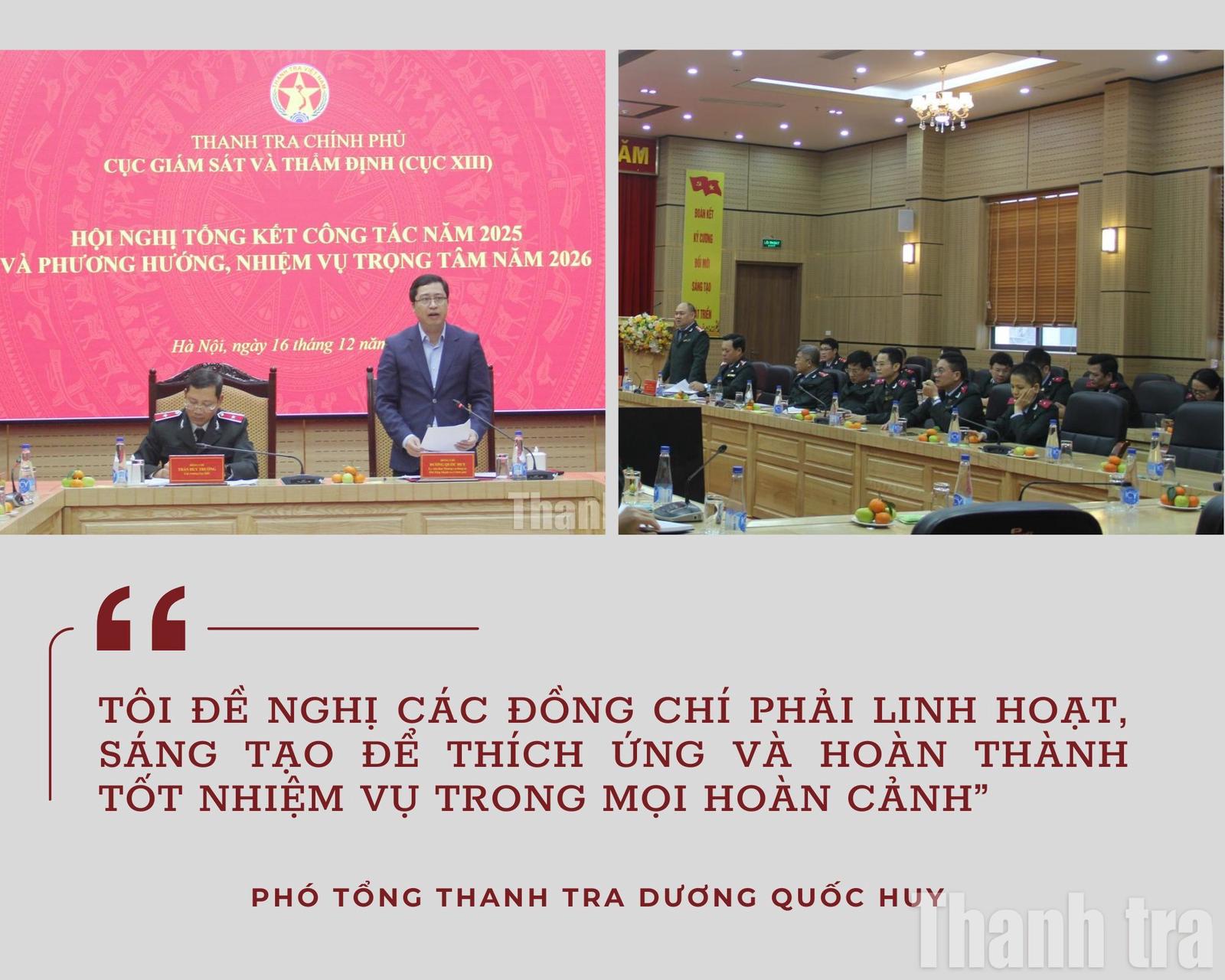 (Thanh tra) - Đó là phát biểu chỉ đạo của Phó Tổng Thanh tra Chính phủ Dương Quốc Huy tại Hội nghị tổng kết công tác năm 2025 và phương hướng, nhiệm vụ trọng tâm năm 2026 của Cục Giám sát và Thẩm định (Cục XIII) diễn ra chiều 16/12.