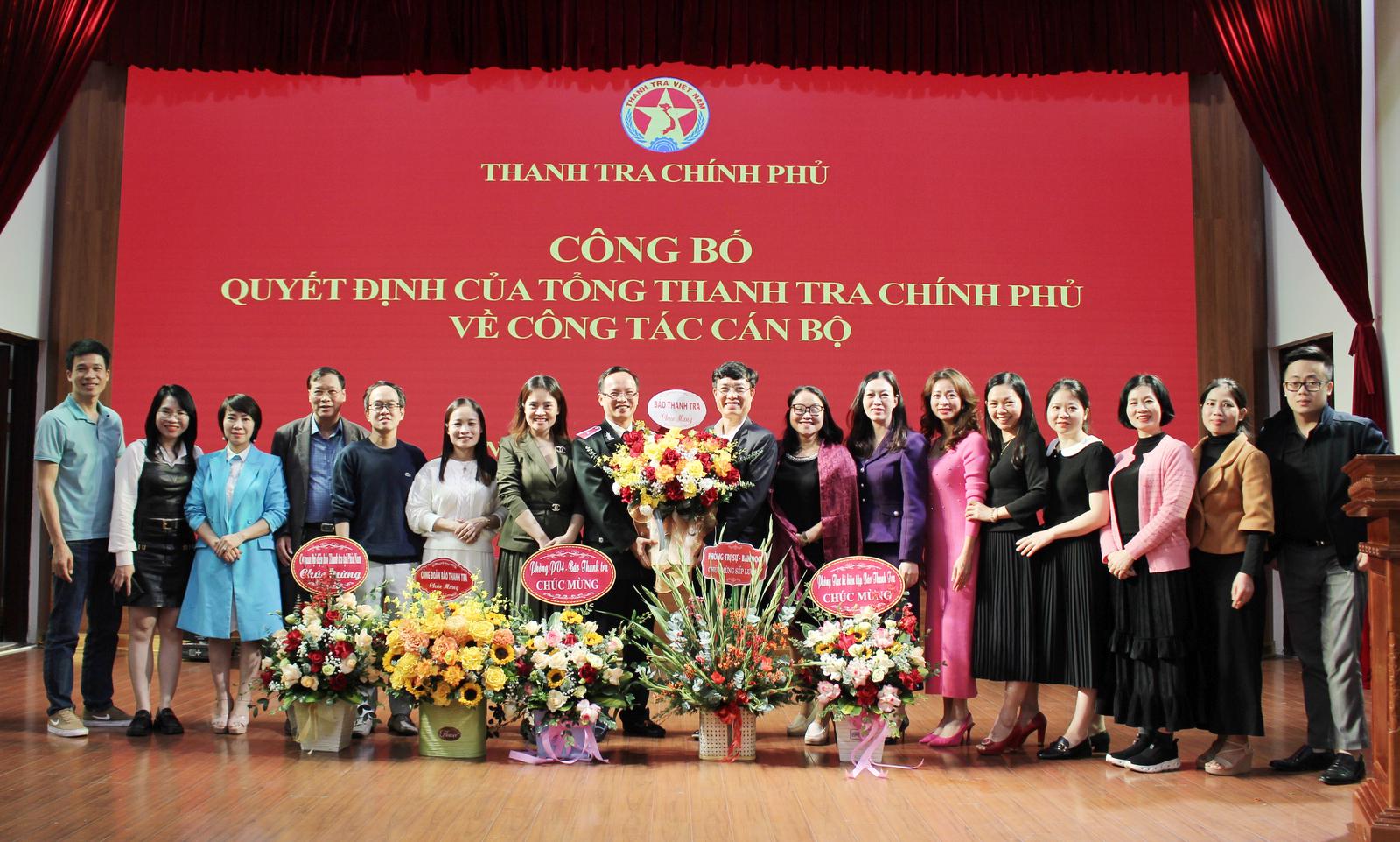 Lãnh đạo Phòng Thư ký biên tập, Báo Thanh tra tặng hoa chúc mừng và chụp ảnh lưu niệm cùng tân Tổng Biên tập Tạp chí Thanh tra. Ảnh: PH