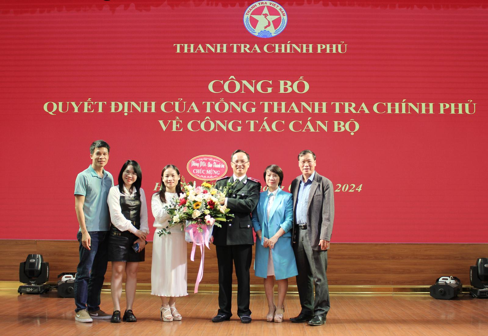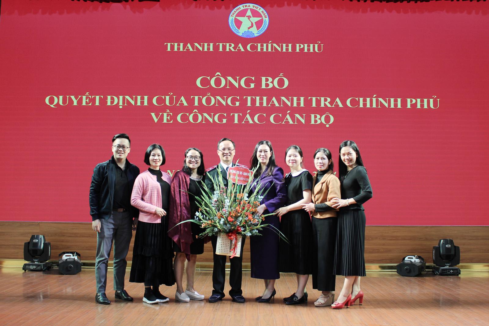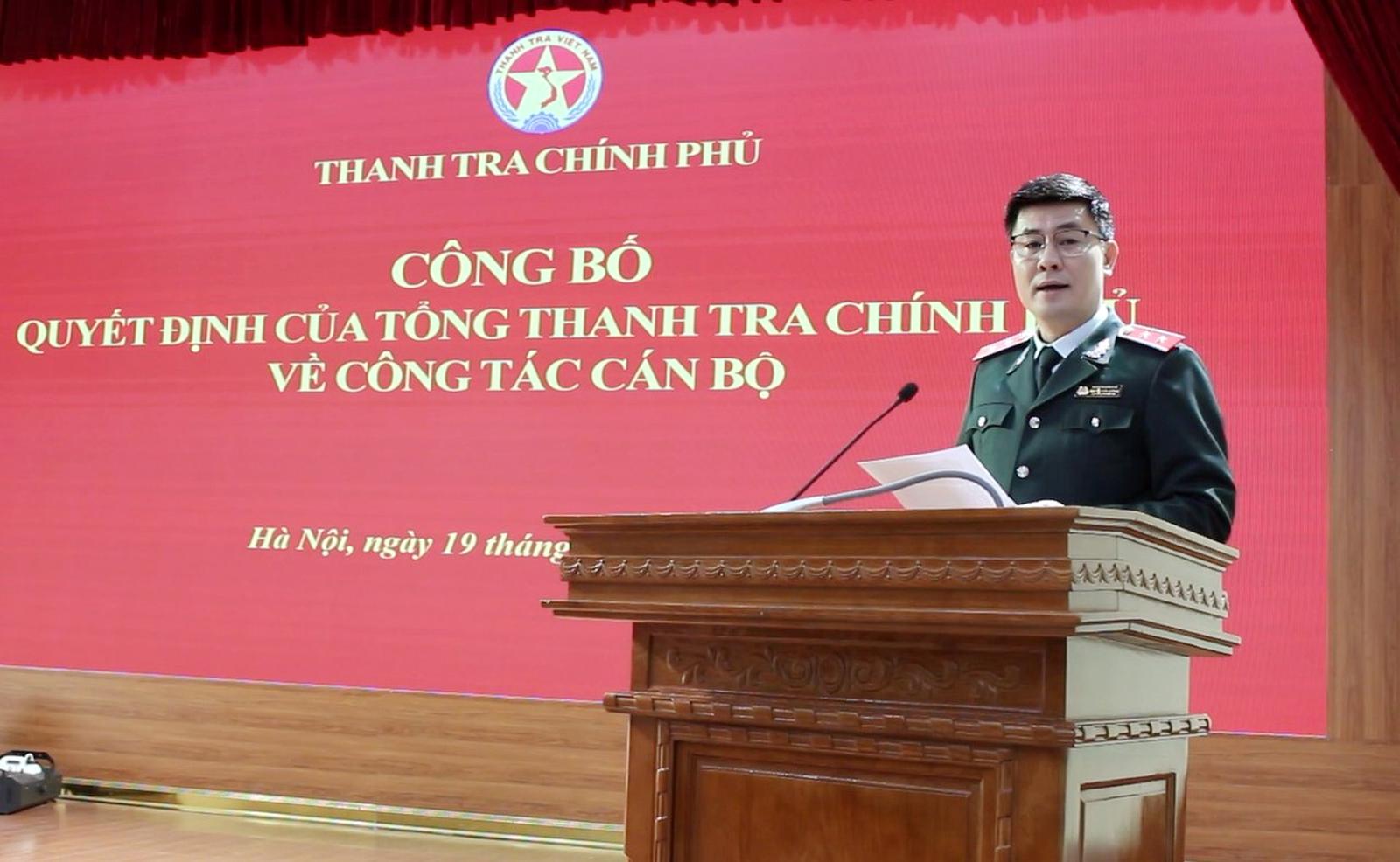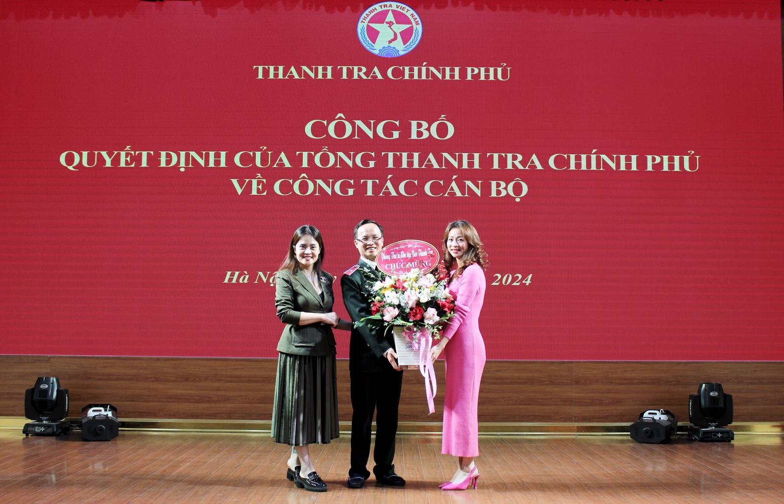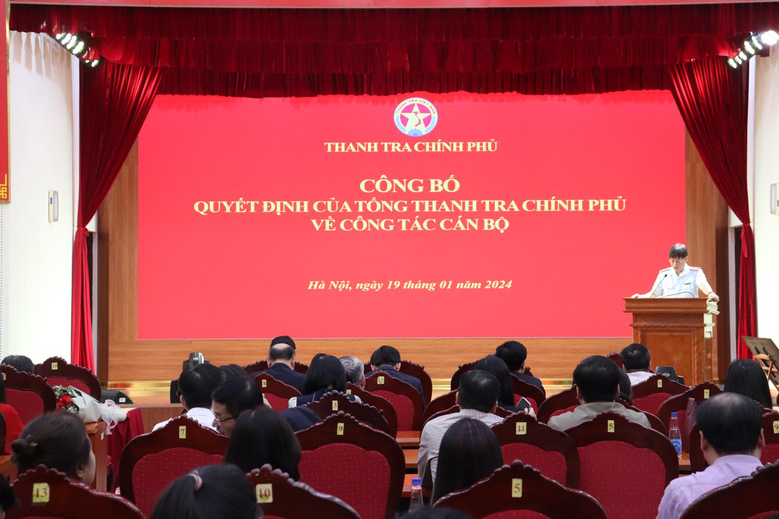 Tại hội nghị, Vụ trưởng Vụ Tổ chức cán bộ Nguyễn Hữu Hòa đã công bố Quyết định số 35/QĐ - TTCP ngày 19/1/2024 của Tổng TTCP Đoàn Hồng Phong về việc điều động, bổ nhiệm có thời hạn ông Nguyễn Văn Lương, Phó Tổng Biên tập Báo Thanh tra giữ chức Tổng Biên tập Tạp chí Thanh tra; Quyết định số 33/QĐ - TTCP, ngày 19/1/2023 bổ nhiệm có thời hạn ông Ngô Đình Long, thanh tra viên chính, Vụ Thanh tra giải quyết khiếu nại, tố cáo khối Văn hoá - Xã hội (Vụ III) giữ chức Phó Vụ trưởng Vụ III; Quyết định số 36/QĐ - TTCP bổ nhiệm có thời hạn ông Chu Đức Thắng, thanh tra viên cao cấp, Vụ Pháp chế, giữ chức Phó Vụ trưởng Vụ Pháp chế.