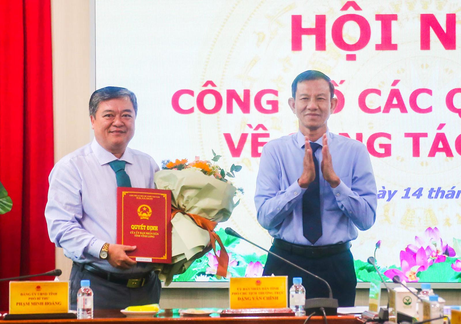 Ông Đặng Văn Chính, Ủy viên Ban Thường vụ Tỉnh ủy, Phó Chủ tịch Thường trực UBND tỉnh Vĩnh Long trao quyết định cho ông Lê Đồng Khởi. Ảnh: Nguyễn Thịnh/ Báo Vĩnh Long