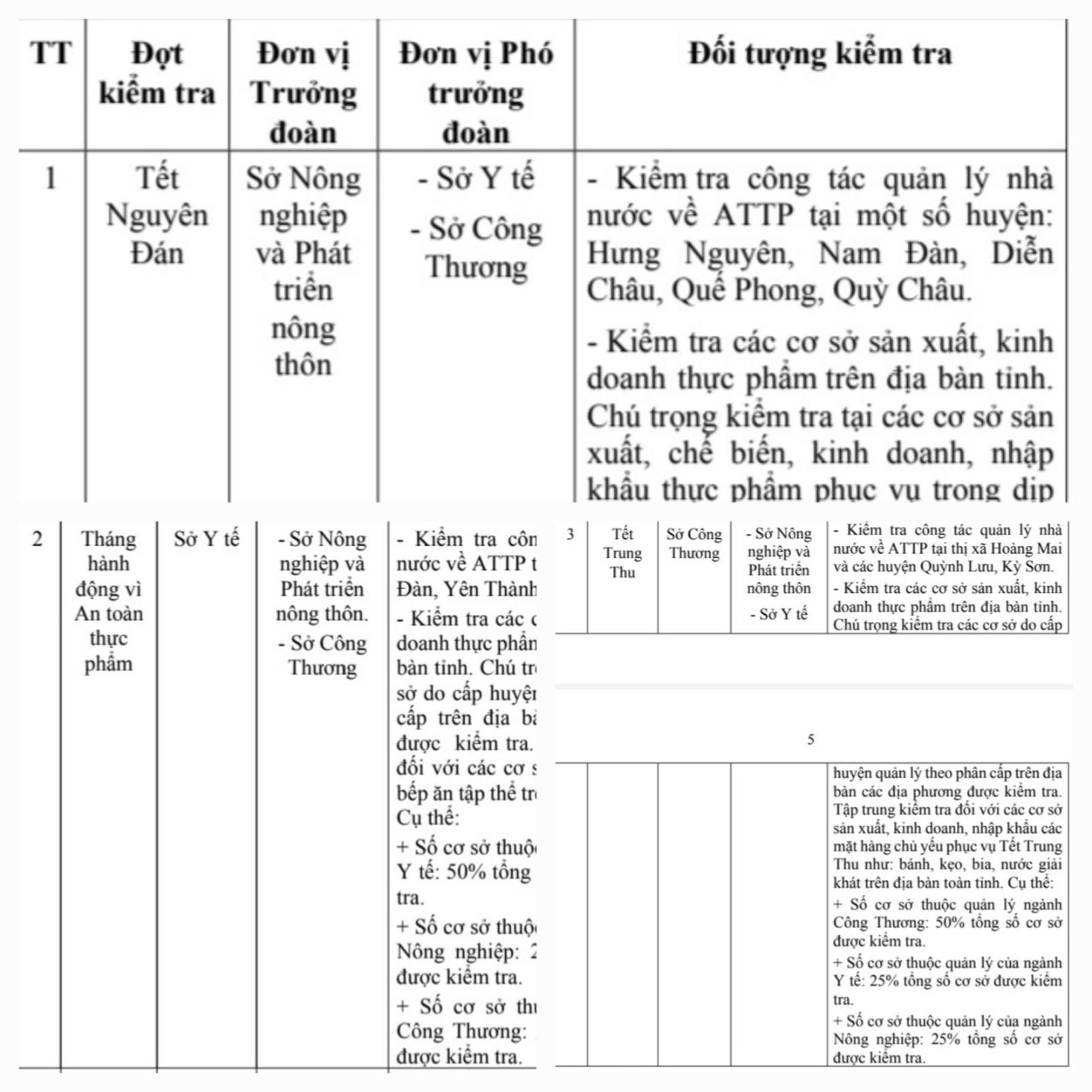 Ngày 2/1/2023, UBND tỉnh Nghệ An phê duyệt Kế hoạch Kiểm tra liên ngành về ATTP năm 2024 trên địa bàn toàn tỉnh Nghệ An nhằm tiếp tục tăng cường trách nhiệm quản lý Nhà nước về ATTP theo Chỉ thị số 13/CT-TTg ngày 9/5/2016 của Thủ tướng Chính phủ và trách nhiệm quản lý Nhà nước về ATTP trong tình hình mới; Kế hoạch số 167-KH/TU ngày 14/3/2023 của Ban Thường vụ Tỉnh ủy Nghệ An thực hiện Chỉ thị số 17-CT/TW về tăng cường bảo đảm an ninh, ATTP trong tình hình mới trên địa bàn tỉnh.