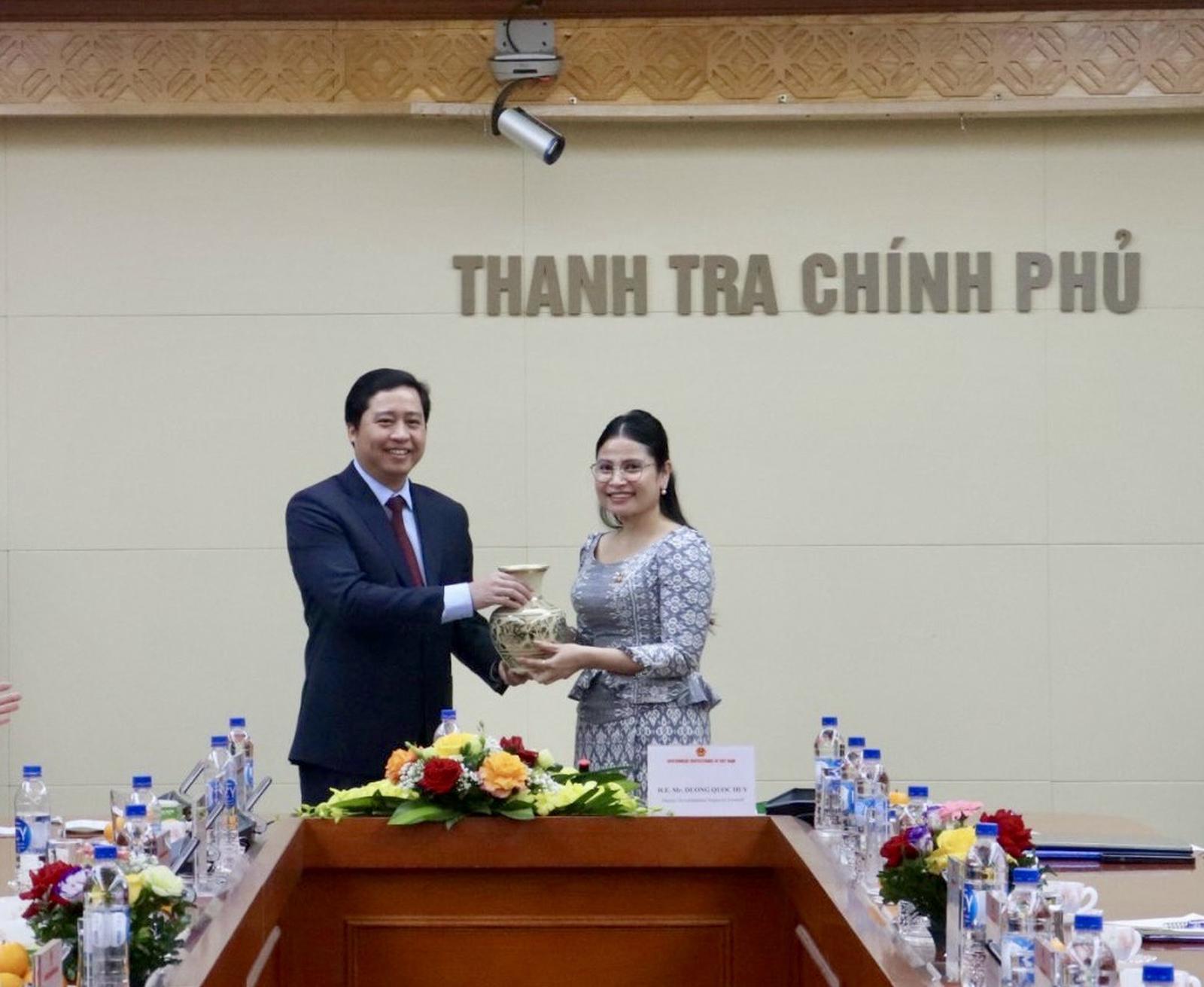 Phó Tổng Thanh tra Dương Quốc Huy trao quà lưu niệm cho đoàn thanh tra Campuchia. Ảnh: TH