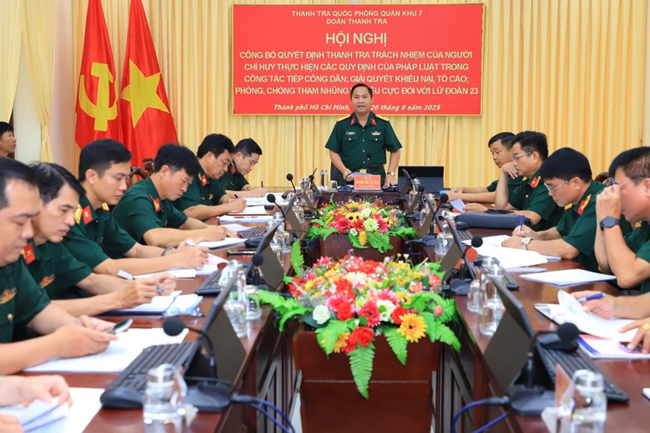 (Thanh tra) - Chiều ngày 26/8, Đoàn công tác Thanh tra Quốc phòng Quân khu 7 chính thức công bố quyết định thanh tra trách nhiệm đối với Lữ đoàn 23. Quyết định thanh tra tập trung vào trách nhiệm của người chỉ huy trong việc thực hiện các quy định của pháp luật về công tác tiếp công dân, giải quyết khiếu nại, tố cáo, cũng như phòng, chống tham nhũng và tiêu cực.