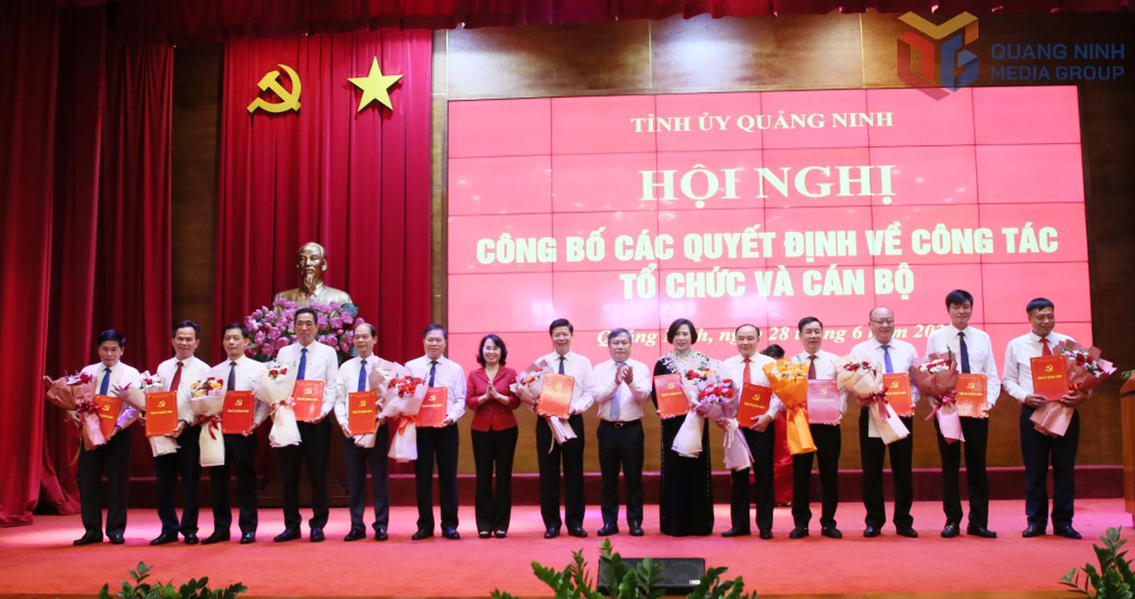Bà Trịnh Thị Minh Thanh, Phó Bí thư Thường trực Tỉnh ủy Quảng Ninh và ông Vũ Quyết Tiến, Phó Bí thư Tỉnh ủy trao các quyết định của Ban Thường vụ Tỉnh ủy, UBND tỉnh, HĐND tỉnh cho các đồng chí. Ảnh: TTTT