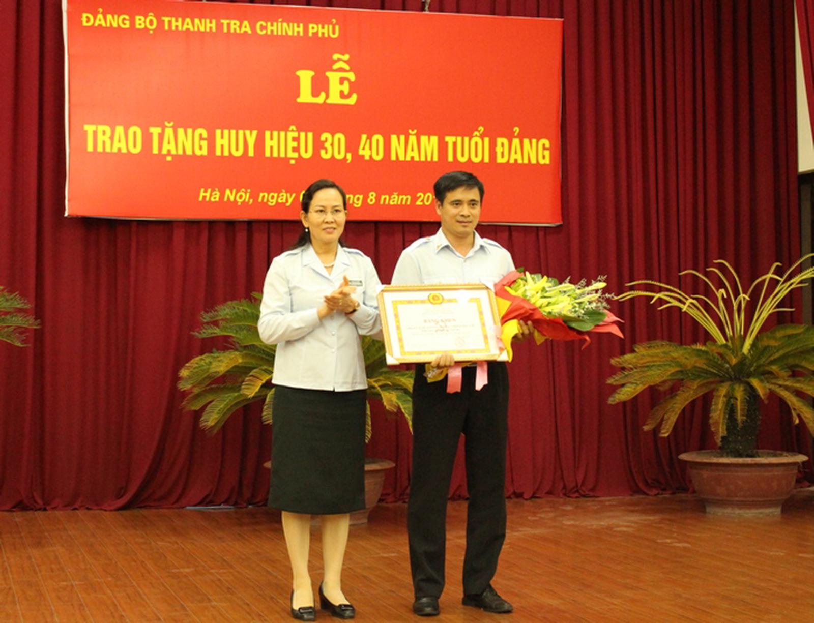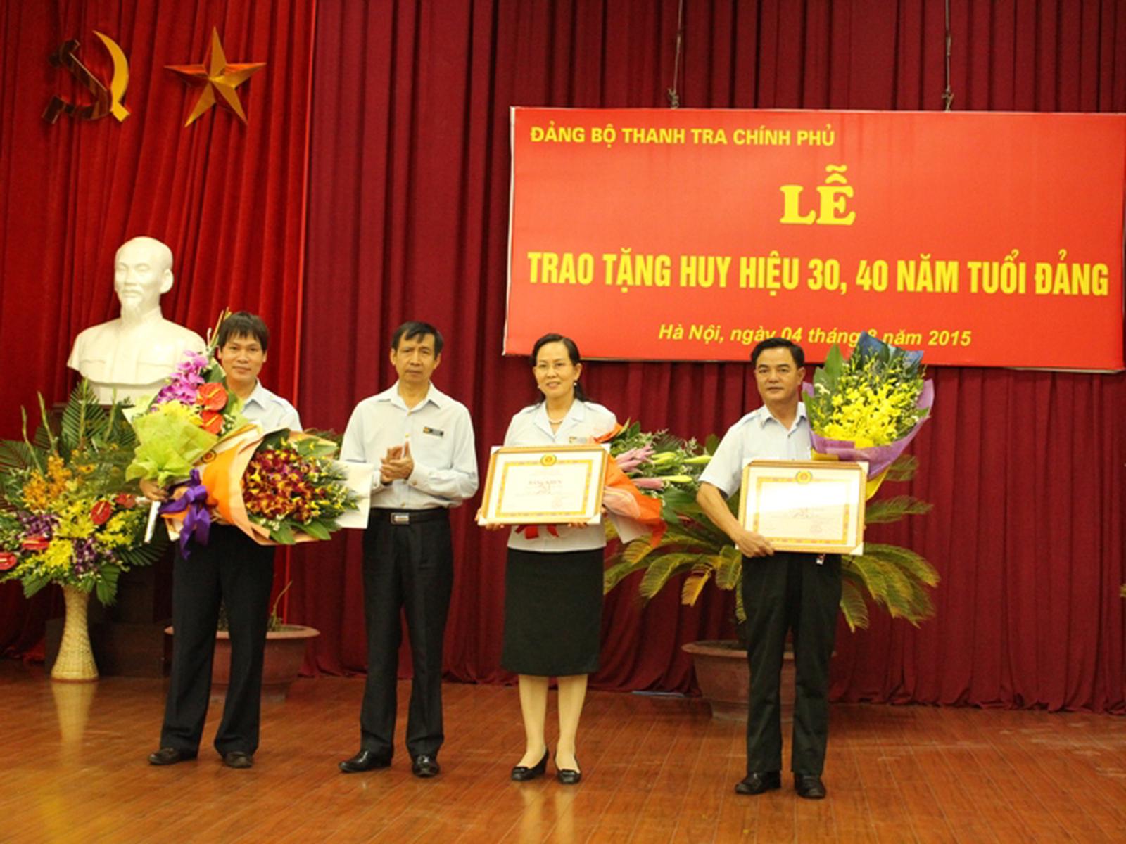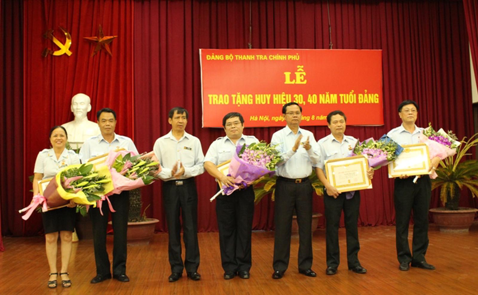Trao tặng Huy hiệu 30, 40 năm tuổi Đảng cho 9 đồng chí Cũng trong chiều 4/8, Đảng bộ TTCP đã tổ chức Lễ trao tặng Huy hiệu 30, 40 năm tuổi Đảng. Tại đây, Tổng Thanh tra Huỳnh Phong Tranh đã công bố Quyết định của Thủ tướng Chính phủ về việc bổ nhiệm ông Đặng Công Huẩn giữ chức Phó Tổng TTCP và đọc Quyết định của Ban Bí thư chỉ định ông Đặng Công Huẩn tham gia Ban Cán sự Đảng ủy TTCP. Trong đợt trao Huy hiệu lần này, Phó Tổng Thanh tra Trần Đức Lượng đã vinh dự được trao tặng Huy hiệu 40 tuổi Đảng. Tổng Thanh tra Huỳnh Phong Tranh và Phó Tổng Thanh tra Lê Tiến Hào trao Huy hiệu 30 tuổi Đảng cho các đồng chí đảng viên. Ảnh HH Huy hiệu 30 năm tuổi Đảng được trao cho các đồng chí: Nguyễn Đức Hạnh - Phó Tổng TTCP, Hoàng Ngọc Văn (Đảng bộ Cục IV), Nguyễn Thái Hồng (Chi bộ Văn phòng Đảng - Đoàn thể), Vũ Hồng Khánh (Chi bộ Vụ III), Nguyễn Đức Phúc (Chi bộ Cục II), Lê Hồng Lĩnh (Chi bộ Vụ Giám sát và Xử lý sau thanh tra), Trần Thị Thanh Hà (Đảng bộ Trường Cán bộ Thanh tra), Nguyễn Hồng Thái (Đảng bộ Cục IV). Thay mặt cho các đồng chí nhận Huy hiệu phát biểu cảm tưởng, ông Hoàng Ngọc Văn chia sẻ: Rất vui mừng, vinh dự khi nhận được phần thưởng cao quý của Đảng nghi nhận phấn đấu của bản thân, đây là mốc son đánh dấu cuộc đời của người cộng sản. Nhận phần thưởng cao quý này thấy trách nhiệm và phải phấn đấu hơn nữa học theo tấm gương đạo đức Hồ Chí Minh để xứng đáng là người Đảng viên cộng sản trong công cuộc đổi mới. Bí thư Đảng ủy - Phó Tổng Thanh tra Lê Thị Thủy tặng Bằng khen cho Đảng bộ Cục III đạt thành tích trong sạch vững mạnh tiêu biểu trong 5 năm liền (2010-2014). Ảnh: HH Phó Tổng Thanh tra Lê Tiến Hào tặng Bằng khen cho các đồng chí đảng viên hoàn thành xuất sắc nhiệm vụ trong 5 năm liền (2010-2014). Ảnh: HH Trong khuôn khổ Lễ trao tặng Huy hiệu, Đảng bộ TTCP cũng đã tặng Bằng khen cho đảng bộ Cục III vì đạt thành tích trong sạch vững mạnh tiêu biểu trong 5 năm liền (2010-2014) và tặng Bằng khen cho 5 đồng chí Đảng viên hoàn thành xuất sắc nhiệm vụ trong 5 năm liền (2010-2014).