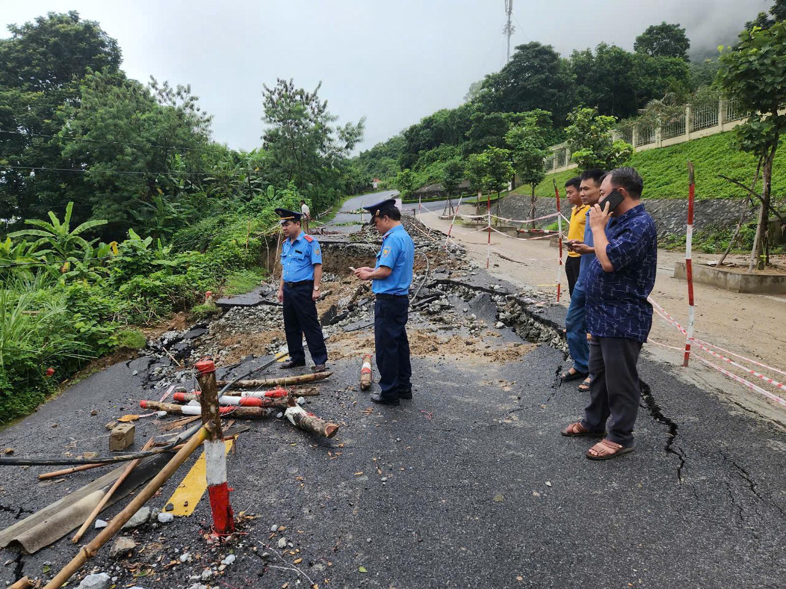 Thanh tra Sở GTVT tham gia đảm bảo ATGT trên tuyến Quốc lộ 15C bị sạt lở do mưa bão số 3 tại huyện Mường Lát, tỉnh Thanh Hoá. Ảnh: Hương Trà