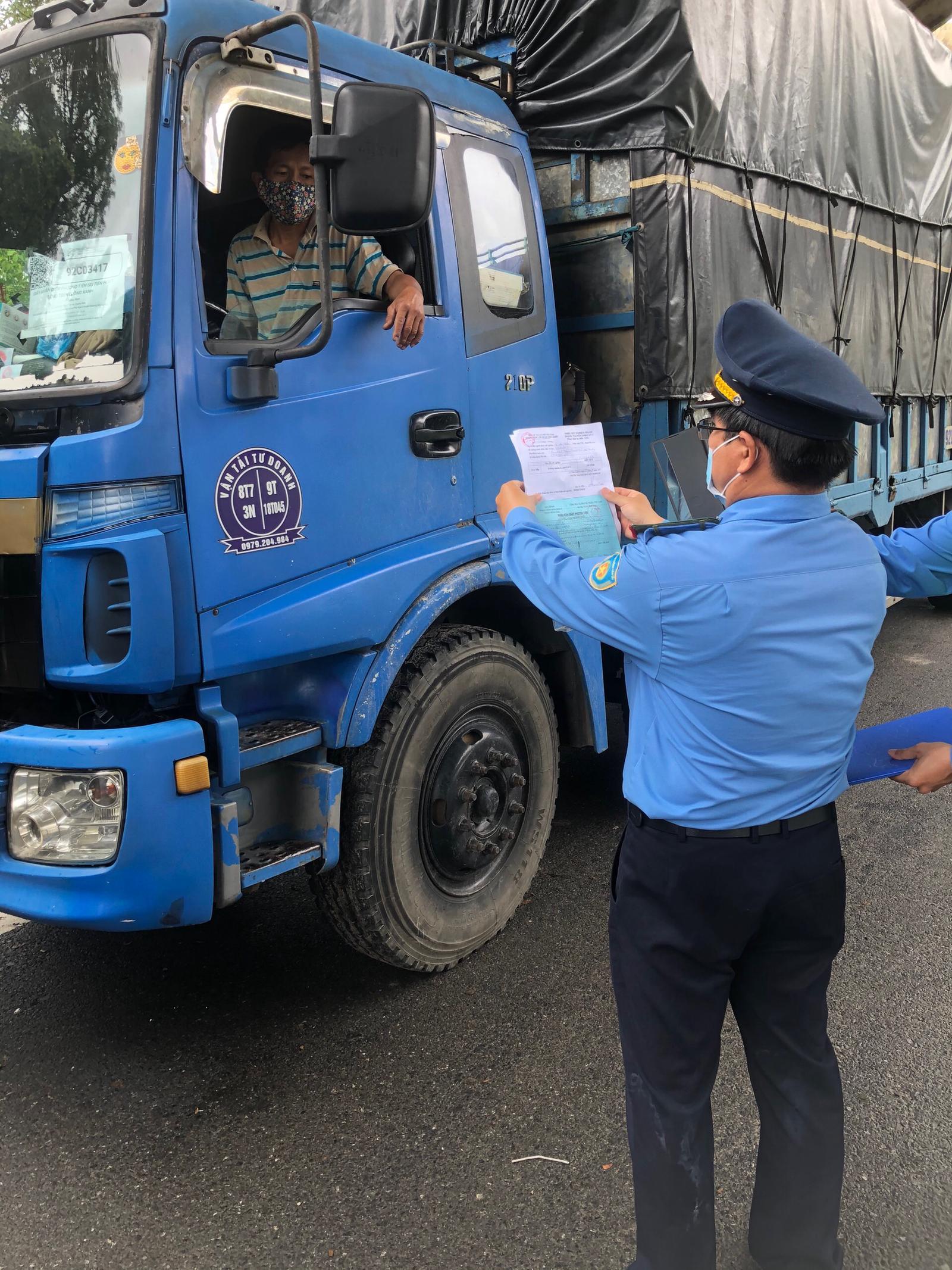 Tuyên truyền, nhắc nhở các phương tiện vận tải ra vào TP. Ảnh: P.T