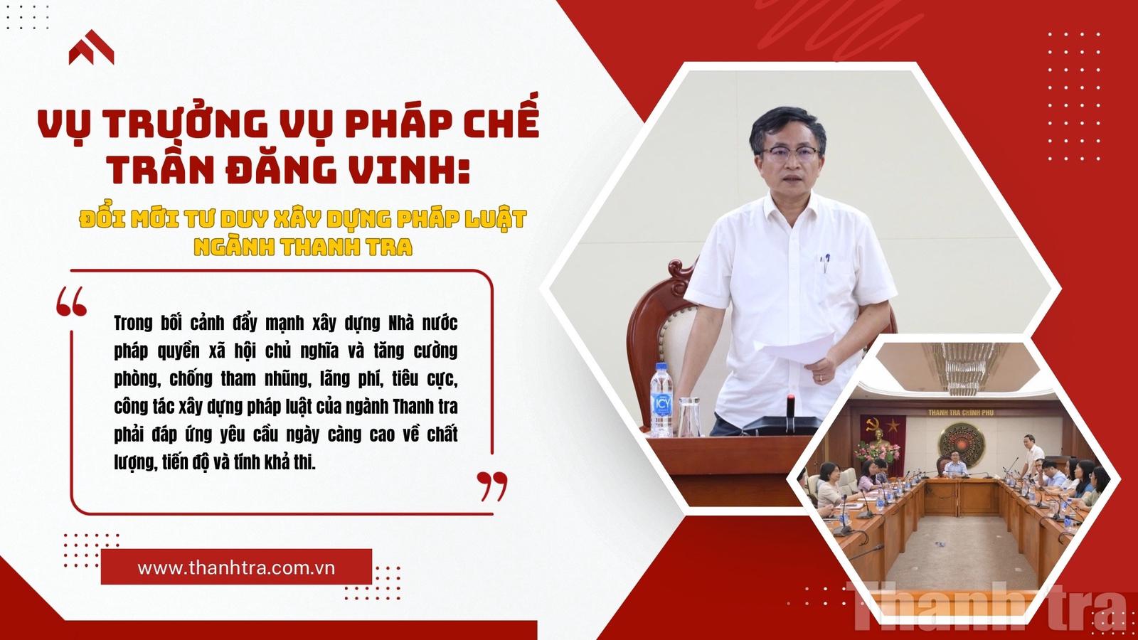 Trả lời phỏng vấn Báo Thanh tra, TS Trần Đăng Vinh, Vụ trưởng Vụ Pháp chế đã nhấn mạnh, công tác xây dựng và hoàn thiện thể chế có vị trí, vai trò đặc biệt quan trọng đối với việc nâng cao hiệu lực, hiệu quả hoạt động quản lý Nhà nước nói chung và hoạt động thanh tra nói riêng. Qua đó góp phần tạo hành lang pháp lý để hoạt động thanh tra được tiến hành một cách thống nhất, khách quan, minh bạch và đúng pháp luật.