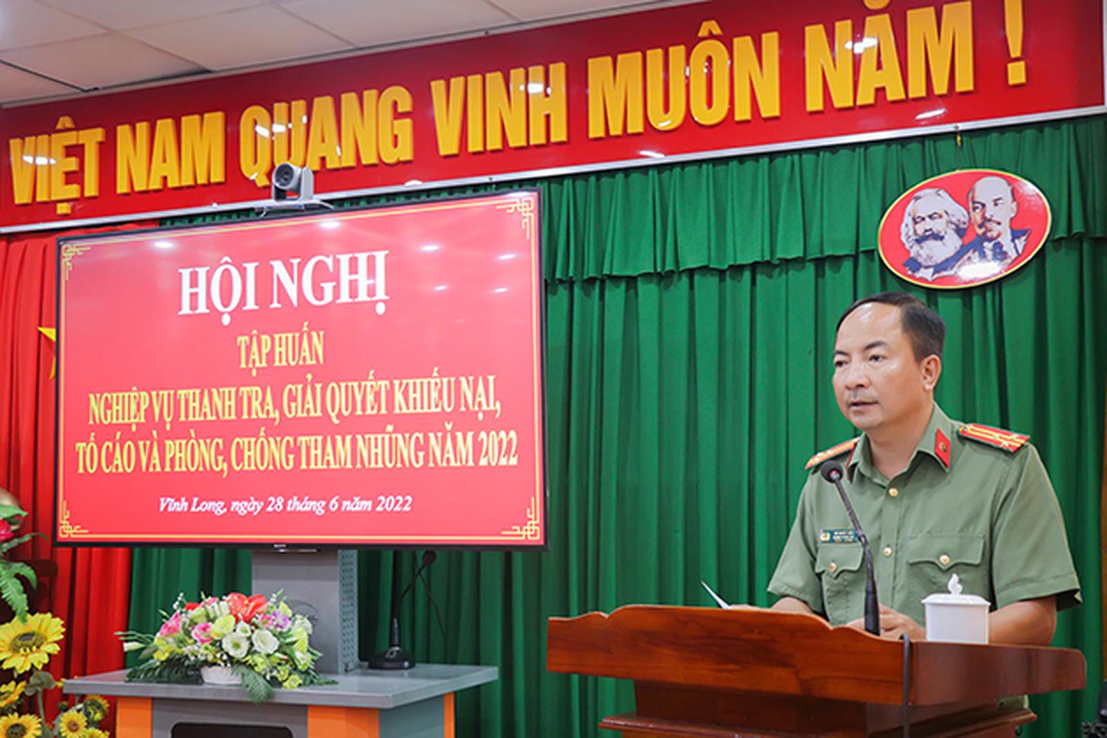 (Thanh tra) - Ngày 28/6, Công an tỉnh Vĩnh Long tổ chức hội nghị tập huấn nghiệp vụ thanh tra, giải quyết khiếu nại, tố cáo và phòng, chống tham nhũng cho lãnh đạo đội phụ trách công tác thanh tra và cán bộ thanh tra chuyên trách, thanh tra kiêm nhiệm tại các đơn vị trực thuộc và công an các huyện, thị xã, thành phố.