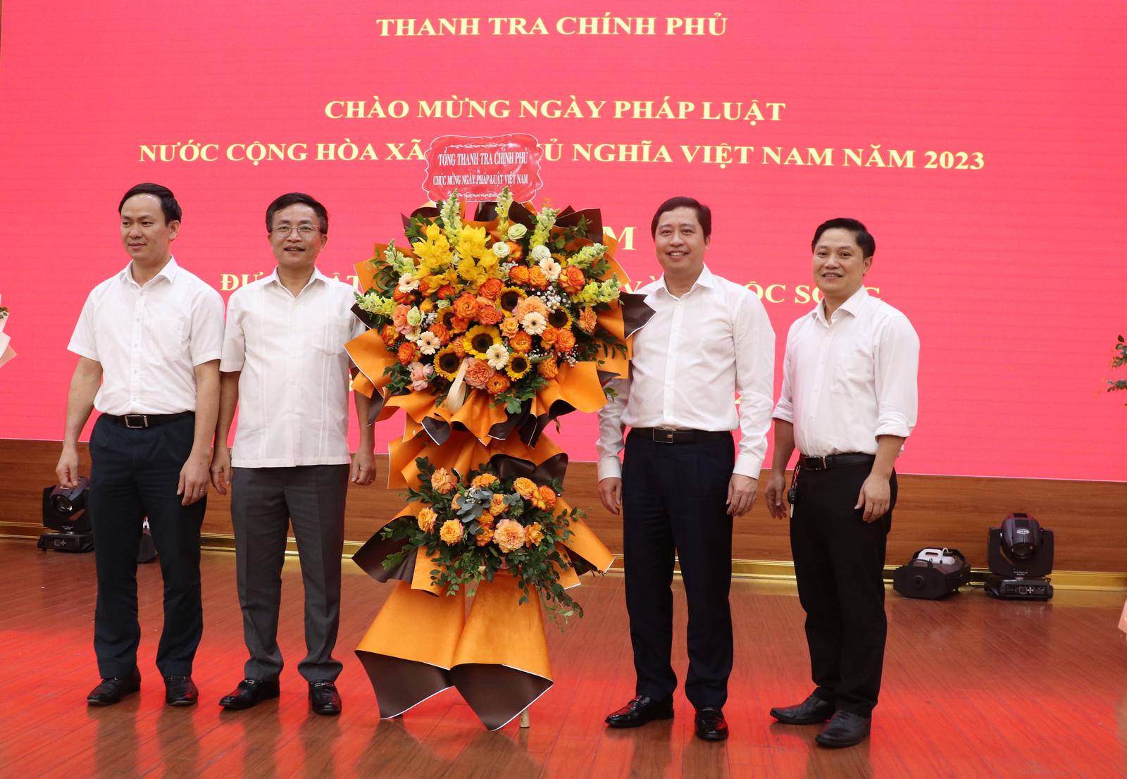 Thay mặt lãnh đạo TTCP, Phó Tổng Thanh tra Dương Quốc Huy tặng hoa chúc mừng Vụ Pháp chế. Ảnh: TH