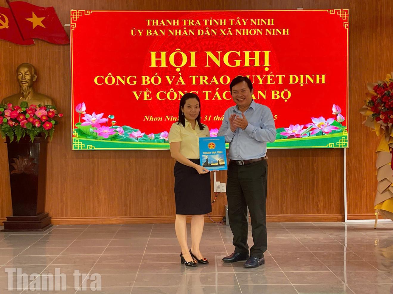 Thanh tra tỉnh Tây Ninh trao quyết định biệt phái cho bà Phạm Thanh Sum về công tác tại UBND xã Nhơn Ninh. Ảnh: Thu Huyền