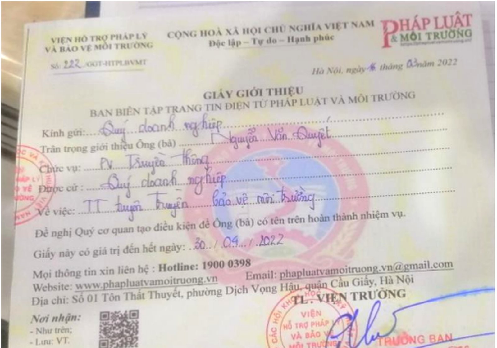 Điều đáng nói, ở phần kính gửi của giấy giới thiệu không xác định đơn vị làm việc cụ thể mà chỉ ghi chung chung là: “Quý doanh nghiệp”; chức vụ trong giấy giới thiệu là phóng viên tuyên truyền; nội dung làm việc: “TT tuyên truyền Luật Bảo vệ môi trường năm 2020” và “TT tuyên truyền bảo vệ môi trường”.
