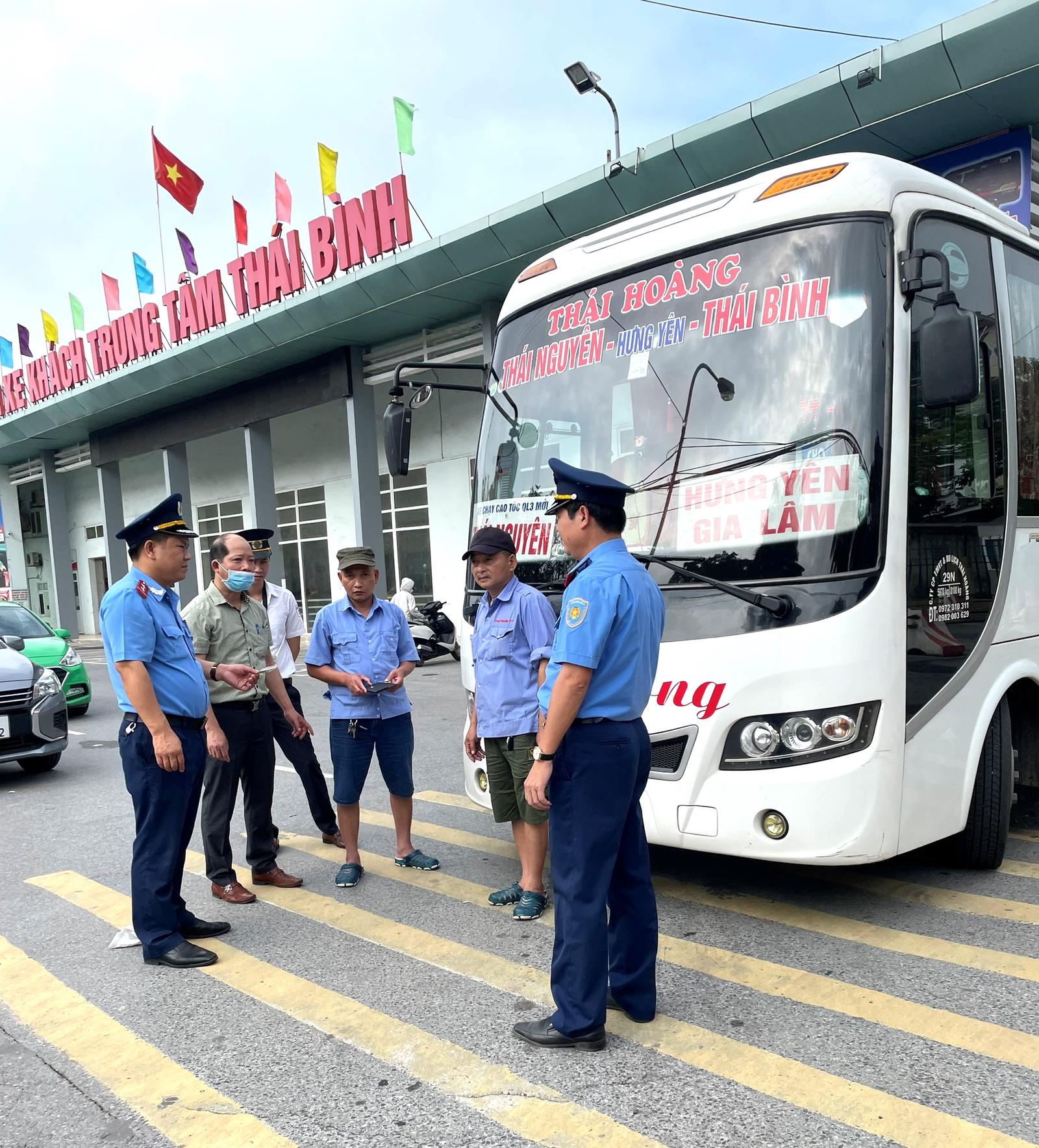Lực lượng Thanh tra GTVT Thái Bình kiểm tra, tuyên truyền tại Bến xe khách trung tâm Thái Bình. Ảnh: Trọng Tài