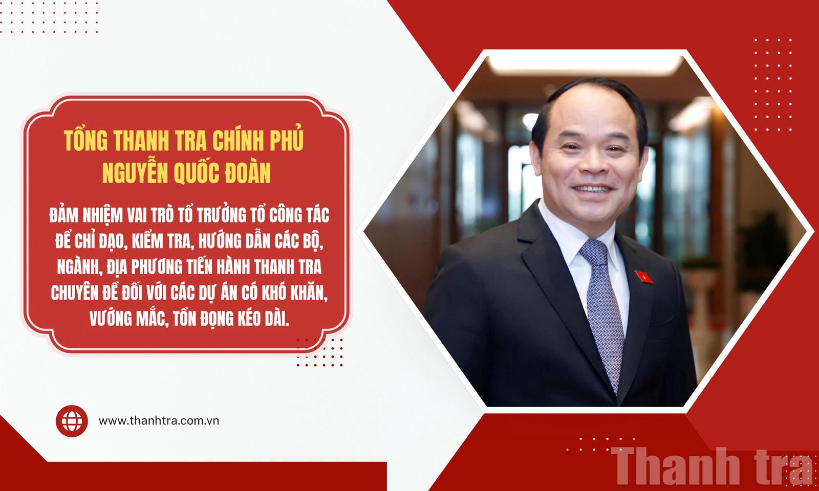 Theo Quyết định, Tổ công tác do ông Nguyễn Quốc Đoàn, Tổng Thanh tra Chính phủ, làm Tổ trưởng. Hai Tổ phó gồm: Ông Hoàng Hưng, Cục trưởng Cục Thanh tra, giải quyết khiếu nại, tố cáo lĩnh vực xây dựng (Cục VII) đảm nhiệm Tổ phó Thường trực và ông Trần Huy Trường, Cục trưởng Cục Thanh tra, giải quyết khiếu nại, tố cáo lĩnh vực nông nghiệp và môi trường (Cục VIII).