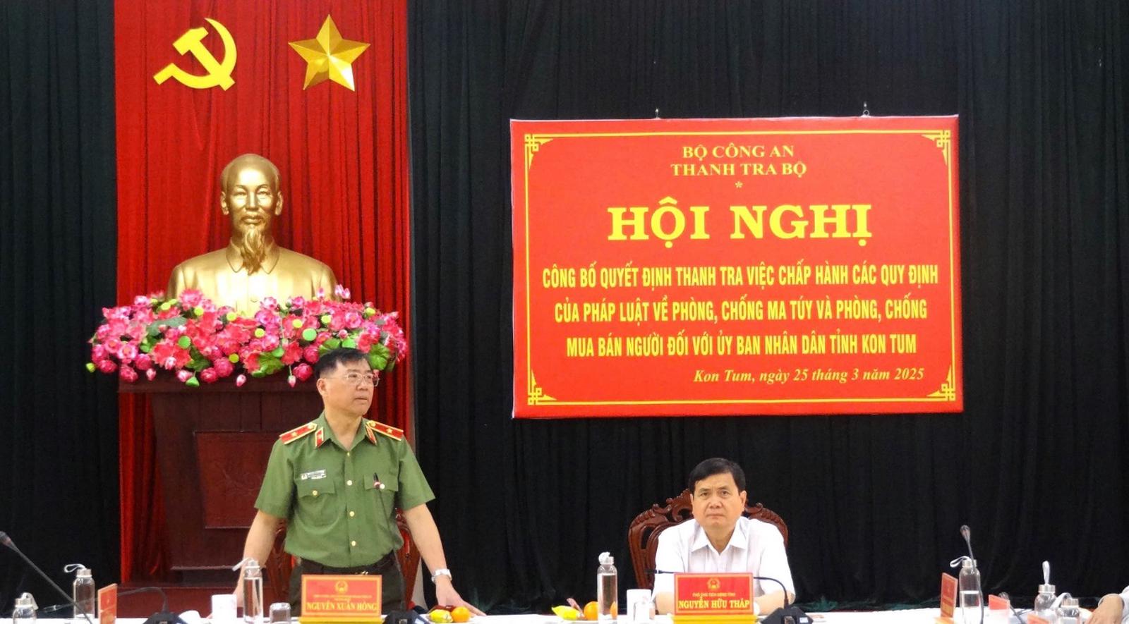 (Thanh tra) - Ngày 25/3/2025, tại Kon Tum, Thanh tra Bộ Công an tổ chức Hội nghị công bố Quyết định số 42/QĐ-X05 ngày 13/3/2025 của Chánh Thanh tra Bộ Công an, thanh tra việc chấp hành các quy định của pháp luật về phòng, chống ma tuý và phòng, chống mua bán người đối với UBND tỉnh Kon Tum. Thiếu tướng Nguyễn Xuân Hồng, Phó Chánh Thanh tra Bộ Công an, Trưởng đoàn thanh tra chủ trì Hội nghị.
