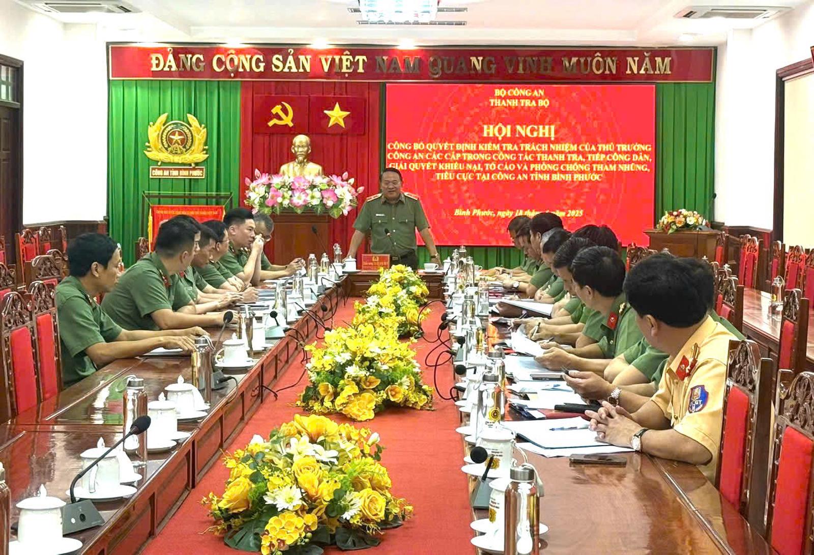 Tại hội nghị công bố quyết định kiểm tra, Phó Chánh Thanh tra Bộ Công an quán triệt đến lãnh đạo, chỉ huy Công an tỉnh Bình Phước các nội dung, mục đích, yêu cầu của cuộc kiểm tra và yêu cầu thực hiện nghiêm túc quyết định kiểm tra; đồng thời yêu cầu các thành viên đoàn chấp hành nghiêm Điều lệnh Công an nhân dân, sự chỉ đạo, điều hành của Trưởng đoàn kiểm tra và các quy định của pháp luật. Trường hợp có vấn đề phát sinh vượt quá thẩm quyền thì thành viên đoàn kiểm tra báo cáo kịp thời với Trưởng đoàn và đề xuất biện pháp xử lý.