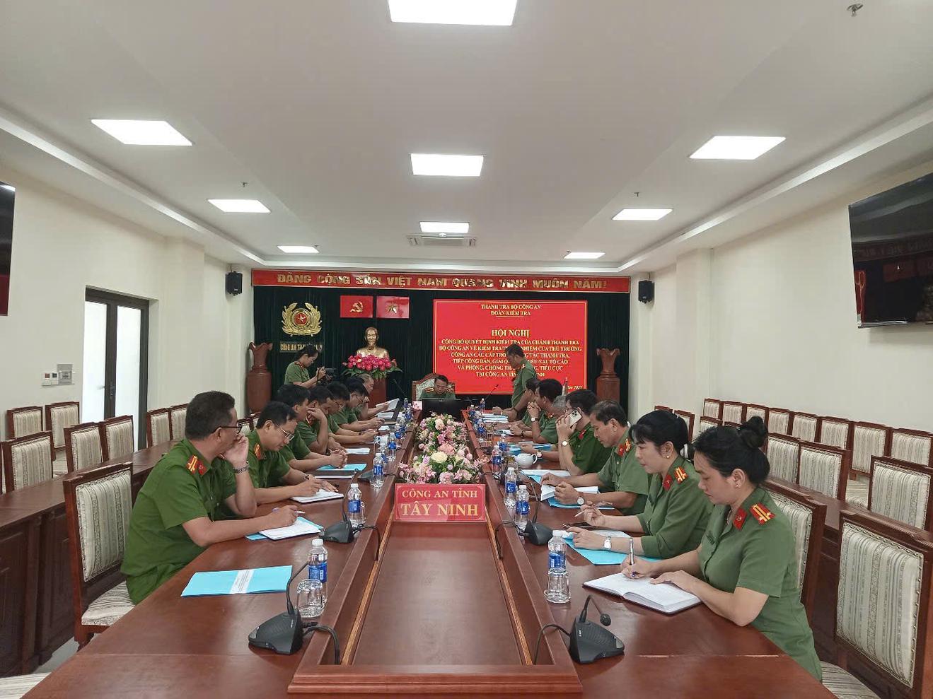 Tại Hội nghị công bố Quyết định kiểm tra, Phó Chánh Thanh tra Bộ Công an đã quán triệt đến lãnh đạo, chỉ huy Công an tỉnh Tây Ninh các nội dung, mục đích, yêu cầu của cuộc kiểm tra và yêu cầu thực hiện nghiêm túc quyết định kiểm tra. Đồng thời, yêu cầu các thành viên đoàn chấp hành nghiêm Điều lệnh Công an nhân dân, sự chỉ đạo, điều hành của Trưởng đoàn kiểm tra và các quy định của pháp luật. Trường hợp có vấn đề phát sinh vượt quá thẩm quyền thì thành viên Đoàn kiểm tra báo cáo kịp thời với Trưởng đoàn và đề xuất biện pháp xử lý.