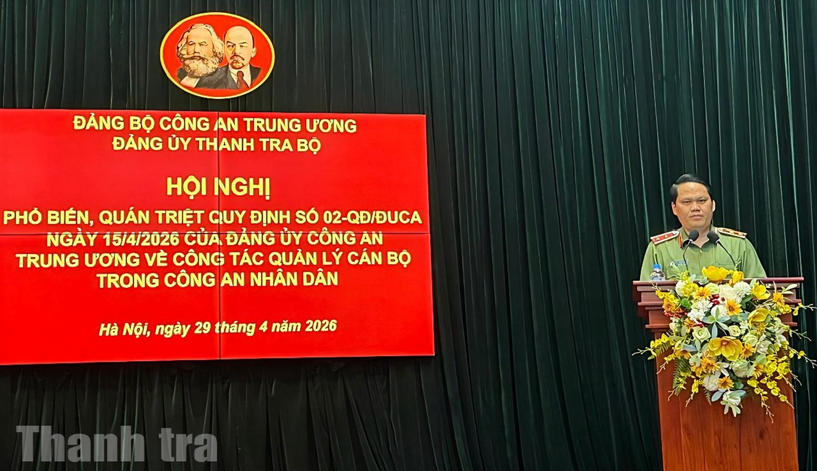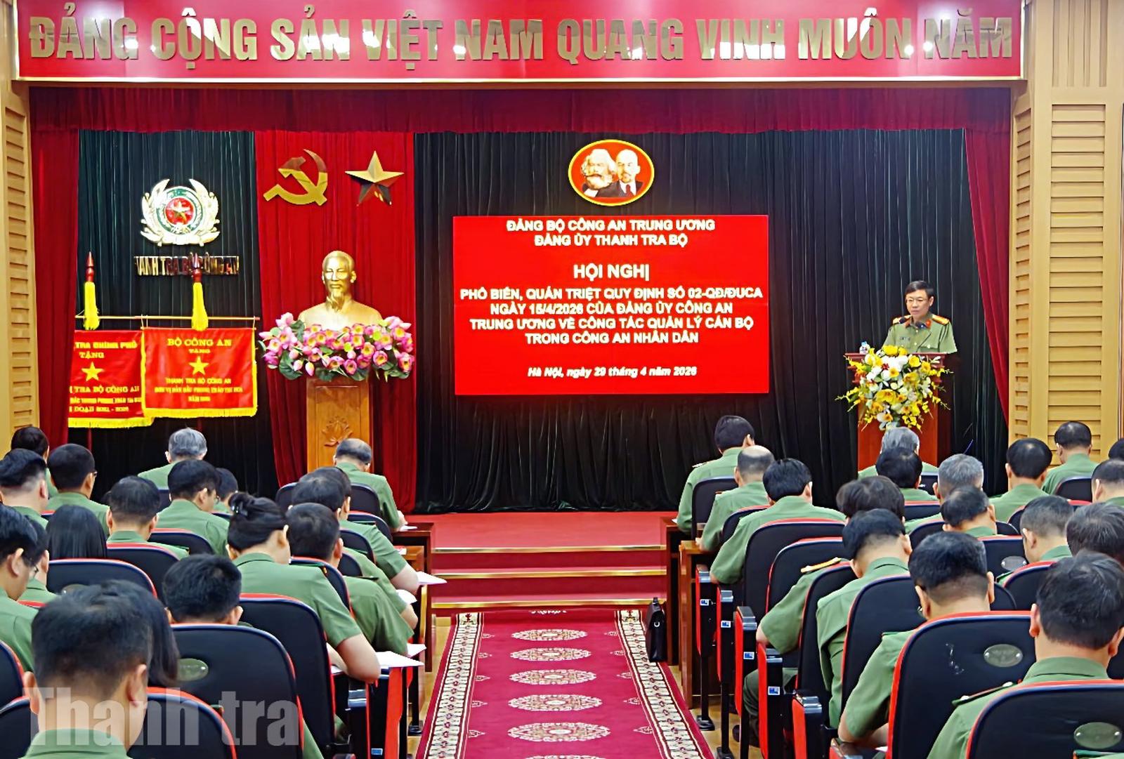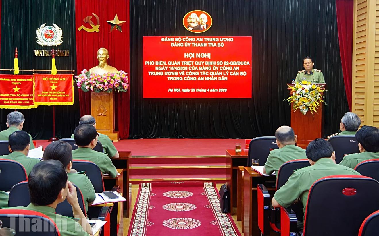 (Thanh tra) - Ngày 29/4, tại trụ sở Thanh tra Bộ Công an, Đảng ủy, lãnh đạo Thanh tra Bộ Công an đã tổ chức Hội nghị phổ biến, quán triệt Quy định số 02-QĐ/ĐUCA ngày 15/4/2026 của Đảng ủy Công an Trung ương về công tác quản lý cán bộ trong Công an nhân dân đến toàn thể đảng viên, cán bộ, chiến sĩ Thanh tra Bộ Công an.