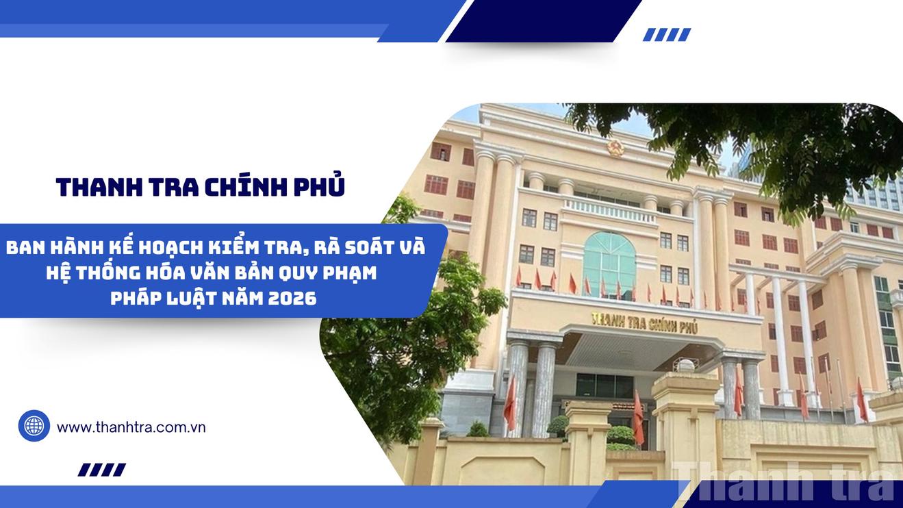 Ngày 31/12/2025, Thanh tra Chính phủ đã ban hành Quyết định số 1388/QĐ-TTCP về việc ban hành Kế hoạch kiểm tra, rà soát, hệ thống hóa và xử lý văn bản quy phạm pháp luật năm 2026 của Thanh tra Chính phủ.