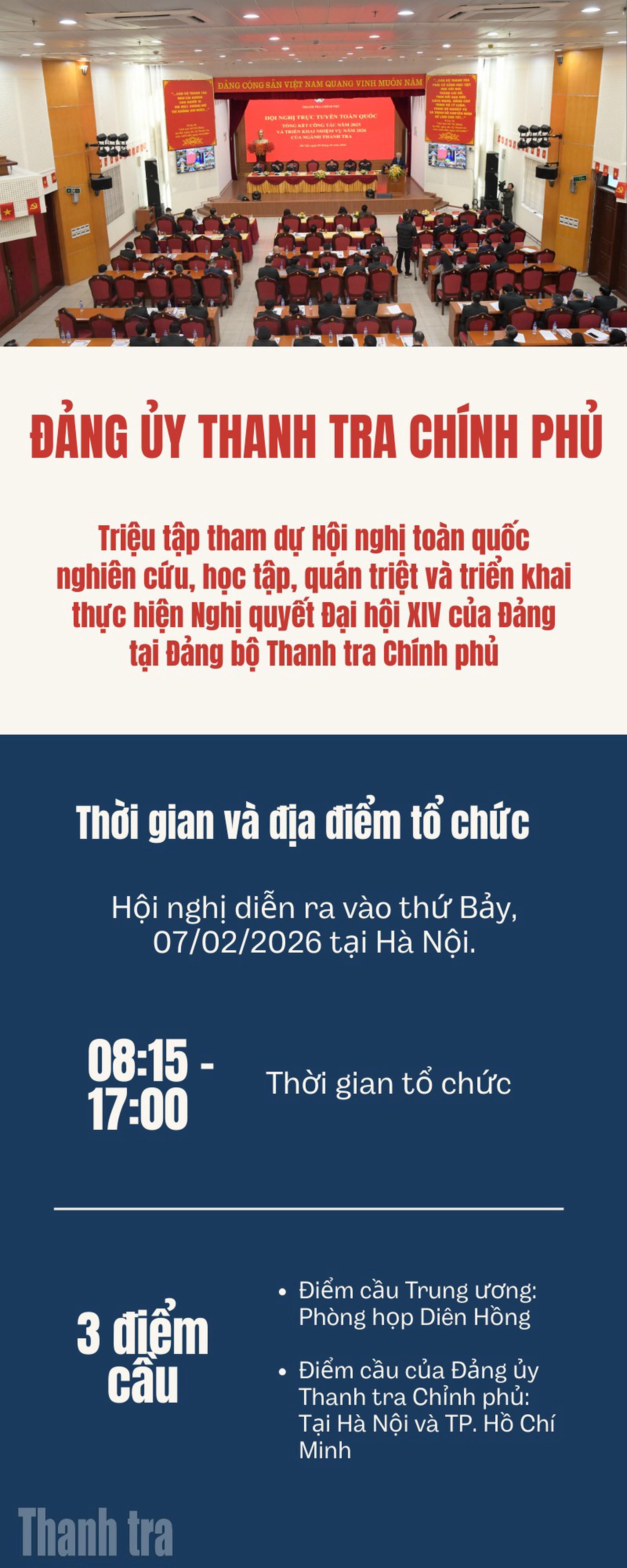 Hình thức tổ chức chủ yếu được thực hiện thông qua Hội nghị trực tuyến kết nối từ điểm cầu Trung ương tại Nhà Quốc hội đến các điểm cầu của Đảng ủy Thanh tra Chính phủ tại Hà Nội và Thành phố Hồ Chí Minh.