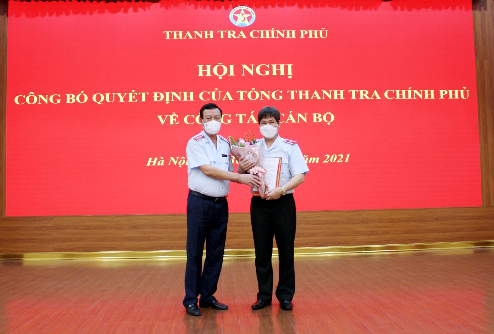 Tổng Thanh tra Chính phủ Đoàn Hồng Phong trao quyết định và tặng hoa chúc mừng tân Vụ trưởng Vụ Giám sát, Thẩm định và Xử lý sau thanh tra Hoàng Hưng. Ảnh: PH