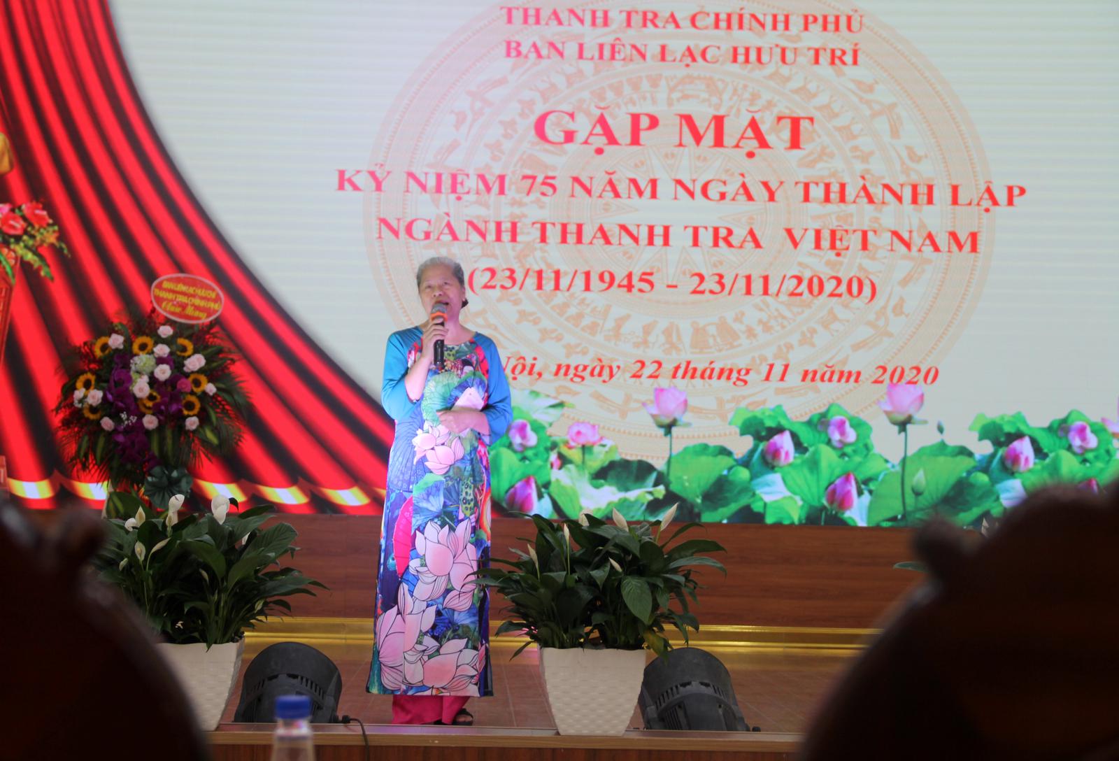 Bà Bùi Phương Thảo, nguyên là phóng viên Báo Thanh tra có tiết mục văn nghệ góp vui tại buổi gặp mặt. Ảnh: PH