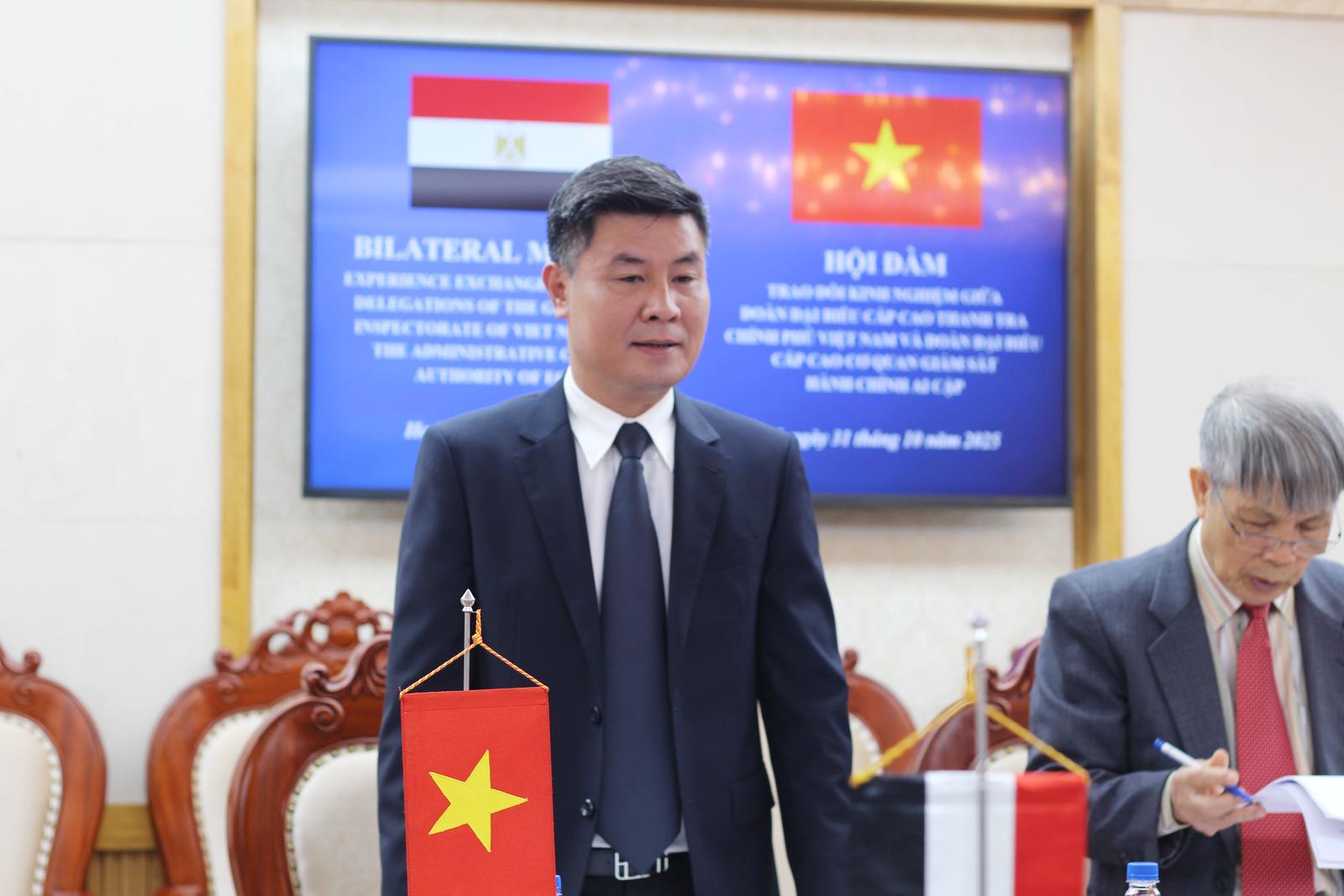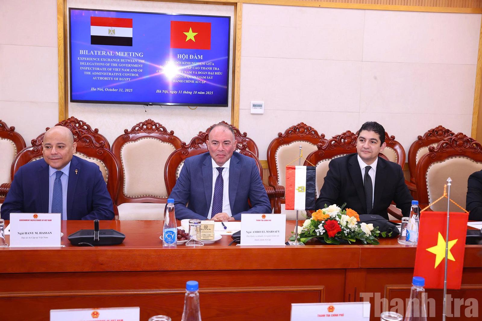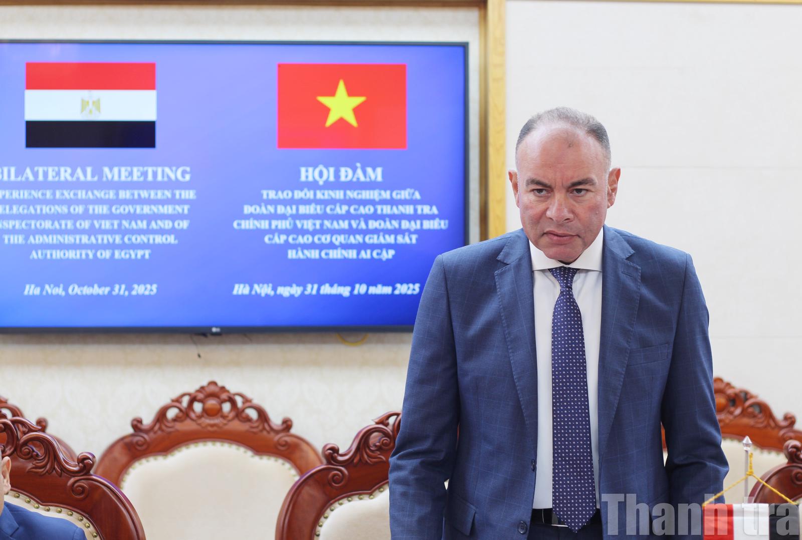 Phó Tổng Thanh tra Nguyễn Văn Cường cho biết, chuyến thăm của Đoàn diễn ra trong bối cảnh hai nước vừa nâng cấp quan hệ lên Đối tác toàn diện nhân dịp Chủ tịch nước Việt Nam thăm cấp Nhà nước Cộng hòa Ả rập Ai Cập hồi tháng 8/2025. “Đoàn đại biểu của Cơ quan Giám sát Ai Cập đến thăm và làm việc với Thanh tra Chính phủ lần này là biểu hiện sinh động, góp phần làm sâu sắc hơn nữa quan hệ giữa hai nước”, Phó Tổng Thanh tra Nguyễn Văn Cường nhấn mạnh.