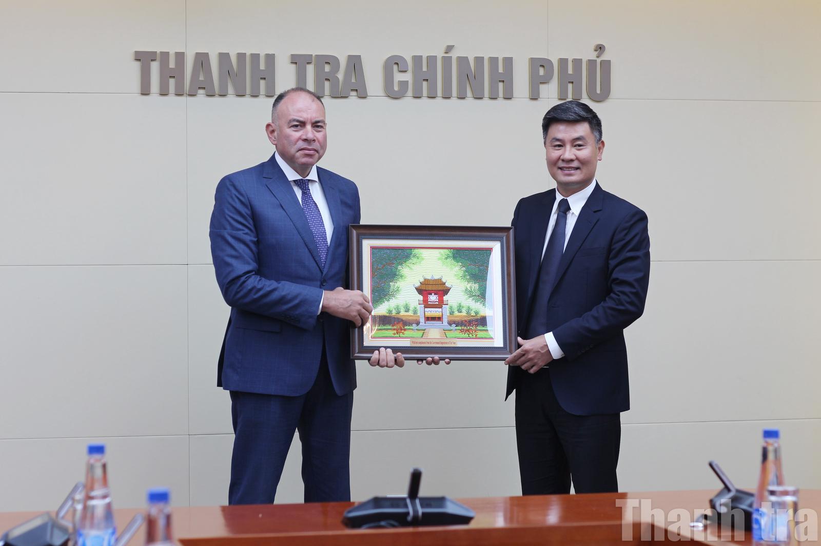 Phó Tổng Thanh tra Chính phủ Nguyễn Văn Cường trao quà lưu niệm là một bức tranh tặng ông Amro Mohamed Elmarsafy, Phó Quốc vụ khanh, Đoàn Cơ quan Giám sát hành chính Ai Cập. Ảnh: LP