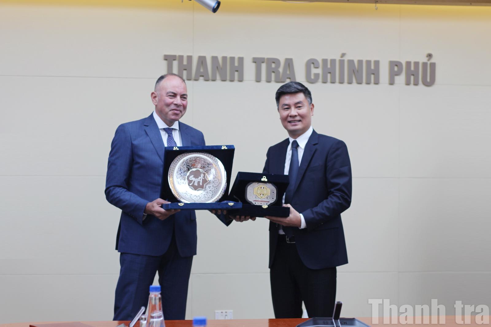 Ông Amro Mohamed Elmarsafy, Phó Quốc vụ khanh, Đoàn Cơ quan Giám sát hành chính Ai Cập trao quà lưu niệm cho Phó Tổng Thanh tra Chính phủ Nguyễn Văn Cường. Ảnh: LP