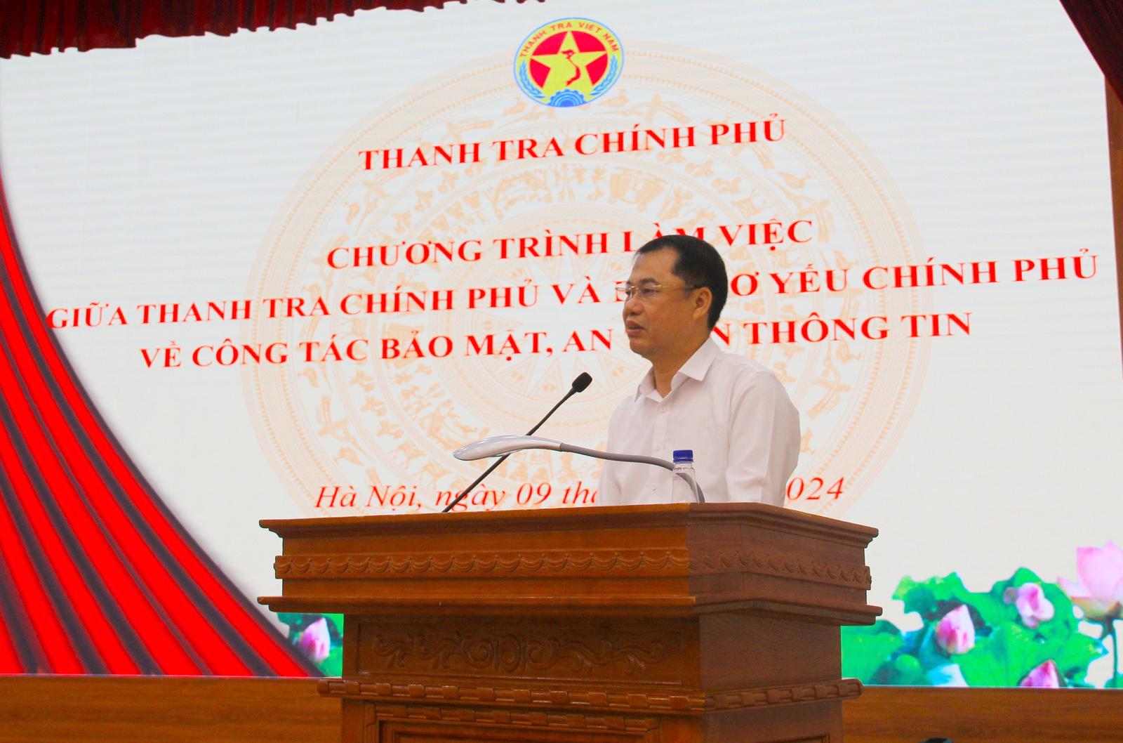 Về công tác bảo mật thông tin, ông Lực đề nghị Thanh tra Chính phủ đề xuất nhu cầu khảo sát, kiểm tra, đánh giá, xác định cụ thể danh mục, hệ thống công nghệ thông tin, dữ liệu hiện trạng bảo mật, an toàn thông tin của hệ thống thông tin cơ sở dữ liệu của Thanh tra Chính phủ để đề nghị cơ quan chức năng xây dựng giải pháp phù hợp để triển khai thực hiện.
