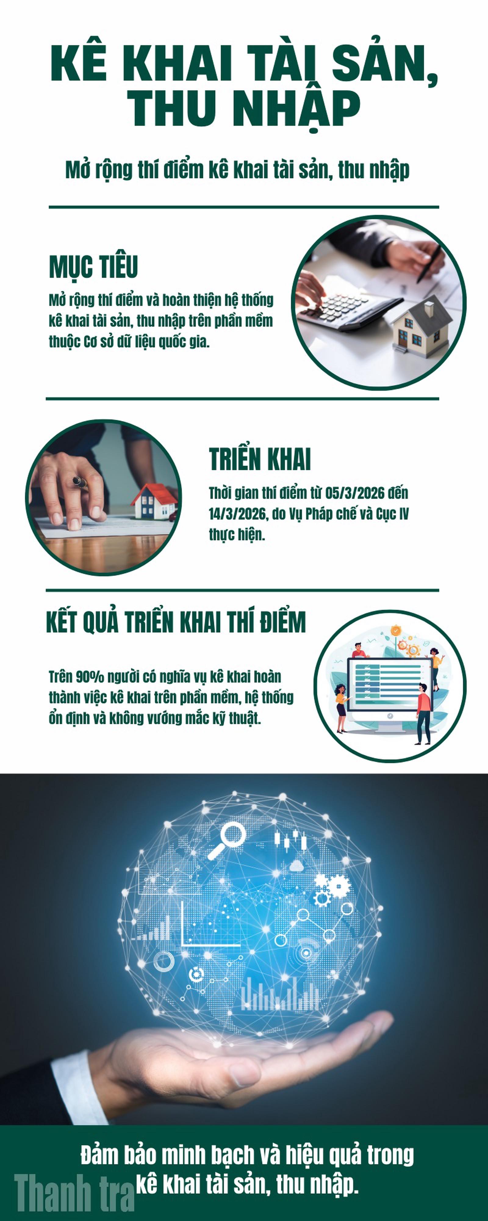 Theo Văn bản số 76/TTCP-VP ngày 26/2/2026, Văn phòng Thanh tra Chính phủ đang tích cực phối hợp với các đơn vị để triển khai thí điểm việc kê khai tài sản, thu nhập cho người có nghĩa vụ kê khai tại Vụ Pháp chế và Cục Phòng, chống tham nhũng, lãng phí, tiêu cực (Cục IV).