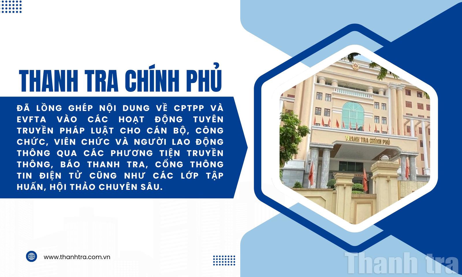 Công tác tuyên truyền, phổ biến nội dung các hiệp định được Thanh tra Chính phủ triển khai một cách bài bản và có trọng tâm. Căn cứ vào các Kế hoạch số 662/KH-TTCP về việc thực hiện Hiệp định CPTPP và Kế hoạch số 1458/KH-TTCP về việc thực hiện Hiệp định EVFTA, Thanh tra Chính phủ đã lồng ghép nội dung về CPTPP và EVFTA vào các hoạt động tuyên truyền pháp luật cho cán bộ, công chức, viên chức và người lao động thông qua các phương tiện truyền thông, Báo Thanh tra, Cổng thông tin điện tử cũng như các lớp tập huấn, hội thảo chuyên sâu.