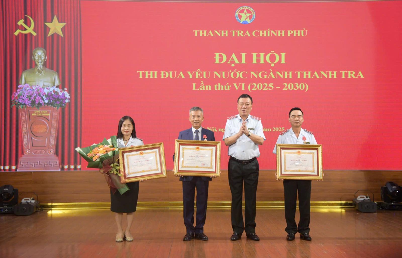 Thừa uỷ quyền của Chủ tịch nước, tại Đại hội Thi đua yêu nước ngành Thanh tra lần thứ VI (2025 - 2030), Tổng Thanh tra Chính phủ Đoàn Hồng Phong trao Huân chương Lao động cho các cá nhân có thành tích xuất sắc. Ảnh: LP